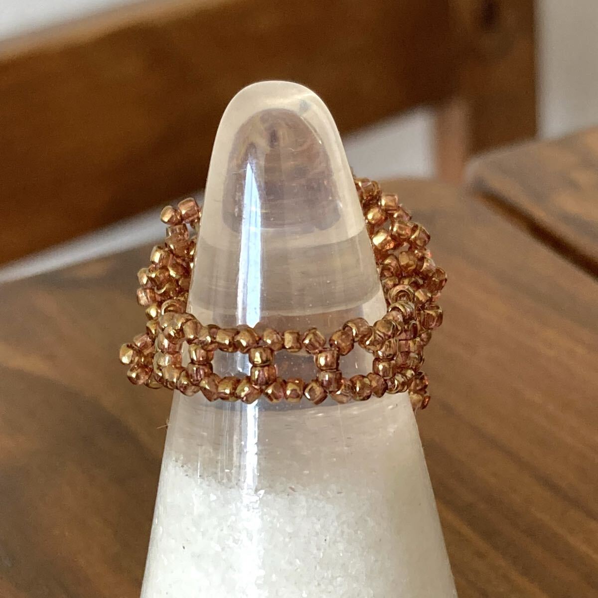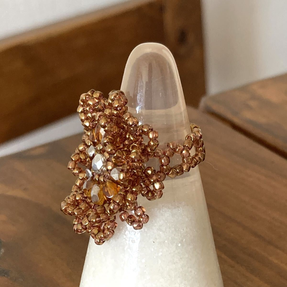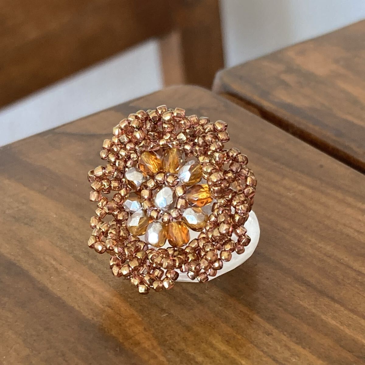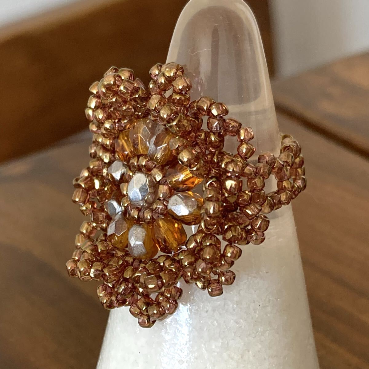 ビーズ リング 指輪 ハンドメイド 大きい丸型のレース風リング ブラウン×シルバー 16-18号です。