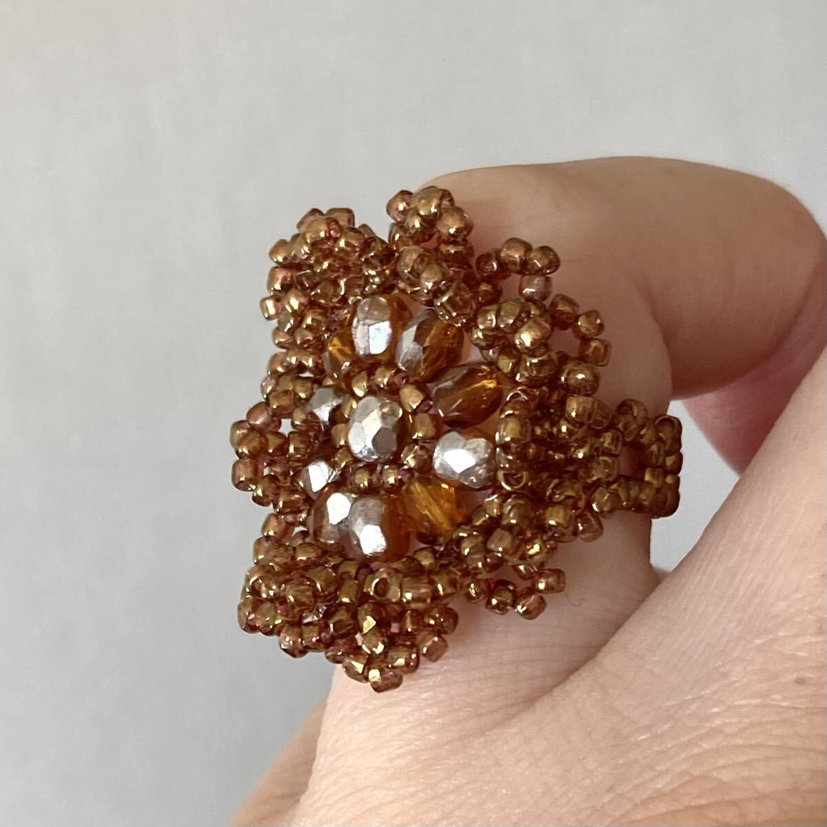 4mmのブラウンに半分シルバーのチェコビーズ、ブラウンのスリーカットビーズで作ったリングです。