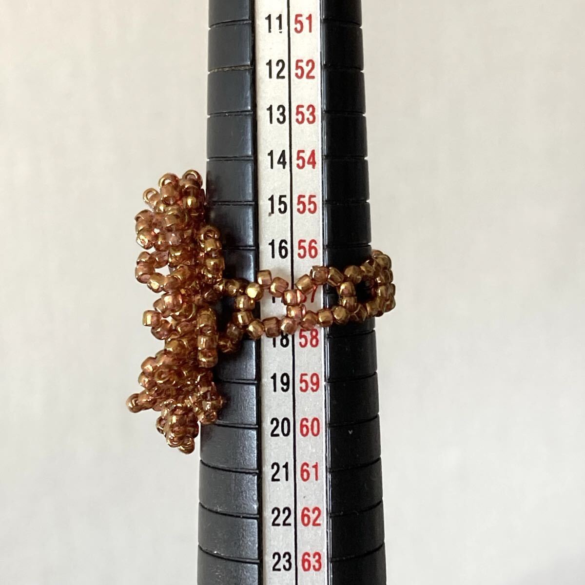 サイズは指周り約5.7cmです。(テグスなので前後します。)