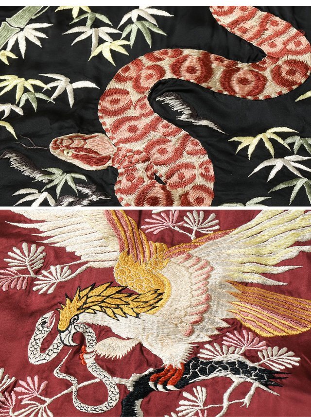 探求心と情熱を持って、上質なアイテムを製作し続けている「テーラー東洋」から、港商Special Edition Early 1950s Style アセテートサテンリバーシブルスカジャン「PIT VIPER×EAGLE&SNAKE」(TT15713-119)のご紹介です。 2025年、巳年の干支であるヘビに因んだスペシャルエディションです。 数あるヴィンテージの中でも蛇をモチーフとした刺繍は非常に珍しいのですが、本作では希少な2着のヴィンテージをもとに、それぞれのA面(主役となる面)を1着に集約させた「両A面」といえる贅沢な仕上がりとなっています。 表面は獲物を求めて彷徨うマムシ(ピットバイパー)を描いた1950年代初期の絵柄。 蛇行する身体の動きに合わせて刺繍の針足を変えることで躍動感を表現し、特徴的な銭形模様(円の中に点のある模様)は横振り刺繍を重ねて立体感を強調することで、迫り来るマムシの迫力を見事に描き出しています。 竹や葉には色糸を複数使い、ホワイトからグリーンに至るグラデーションで奥行きのある夜の竹林を表現。 ブラック×ゴールドで色合わせされたボディとリブに対し、紅白のパイピングがアクセントとなっています。 リバーシブル面は白蛇を咥え、翼を広げる鷲の絵柄。 ホワイト、ゴールド、ピンクなど淡い色糸のグラデーションで重なる羽根の陰影まで緻密に描写し、鷲の頭や蛇の鱗、留まる松の枝にブラックを差すことで刺繍を引き締めています。 また、通常のスカジャンでは身頃と袖のラインの色を合わせるのが一般的ですが、本作はワインの身頃に対してグリーンの袖下、袖山のラインはシルバー。 3色を組み合わせたボディはヴィンテージでもレアな仕様で、刺繍と同様にリブへブラックを差すことで全体を引き締めています。 テーラー東洋のコレクションの中でも特に厳選した逸品をディテールにこだわり再現するのが、このスペシャルエディション。 横振り刺繍で緻密に描かれた図案はもとより、アセテート生地の打ち込みを調整してヴィンテージと遜色なく仕上げ、ウールリブも旧式の横編み機を使用して1着ずつ編み上げています。 リバーシブル仕様のファスナーについても50年以上前のファスニング機械を再稼働させ、当時と同じ手曲げのものを再現。 テーラー東洋の前身である港商(こうしょう)商会のラベルを使い、ヴィンテージスカジャンの最盛期を彷彿とさせる仕上がりとなっています。 1枚持っているだけでずっと使えるアイテムです。 | ||||||||||||||||||||