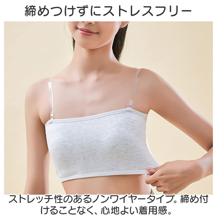 商品説明 | ・・動きやすく色んなシーンで活躍!キッズ用「チューブトップブラ」が新登場。 ・【ダンスなどのアクティブシーンに】 ・バストまわりを包み込む幅広のチューブトップブラ。ダンスや部活など、アクティブに動くシーンにぴったり。 ・【お肌に優しく馴染む素材】 ・柔かな肌触りのコットン混紡素材。チクチク感がなく、デリケート肌にも安心。 ・【締めつけずにストレスフリー】 ・ストレッチ性のあるノンワイヤータイプ。締め付けることなく、心地よい着用感。 ・【バストをふんわり守る固定パッド】 ・バストを優しく保護するソフトパッドを装備。縫い付けられているのでズレる心配がなく、浅めのつくりで程よいシルエットをキープ。 ・【頭からすっぽり被るだけ】 ・ホックなどがなく、着脱がとっても簡単。着替えもスマートに。 ・【ストラップはお好みでアレンジ】 ・オフショルダーなど、肩の出るトップスに♪透け感のあるお洋服にも使える、長さ調節可能な透明ストラップも付属。 ・【何枚あっても嬉しいシンプルブラ】 ・トップスを選ばず使いやすい、無地カラー。洗い替え用に色違いで揃えるのもおすすめ。 |