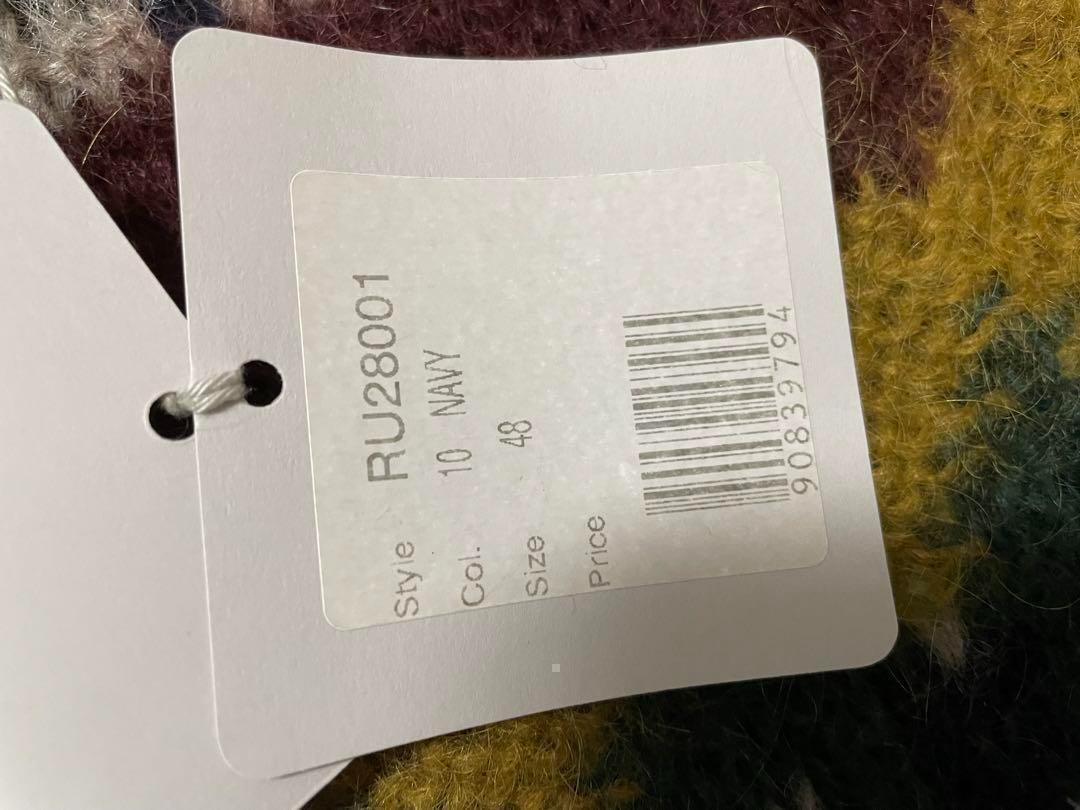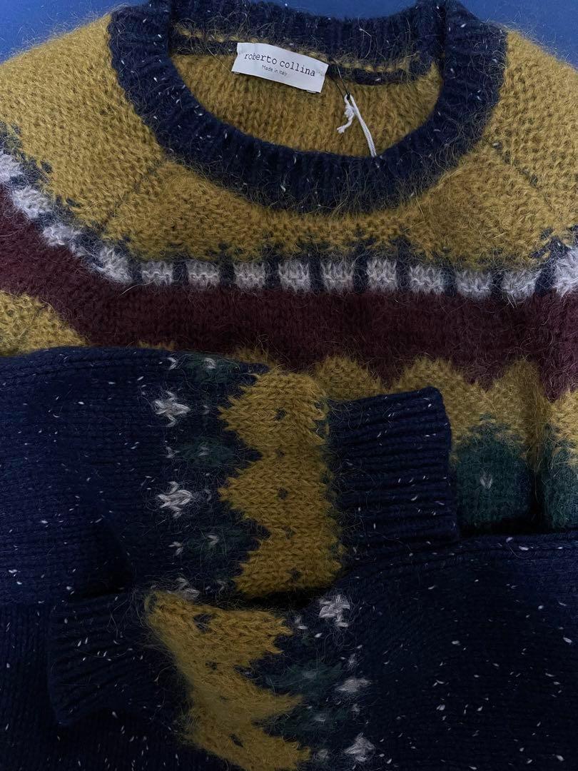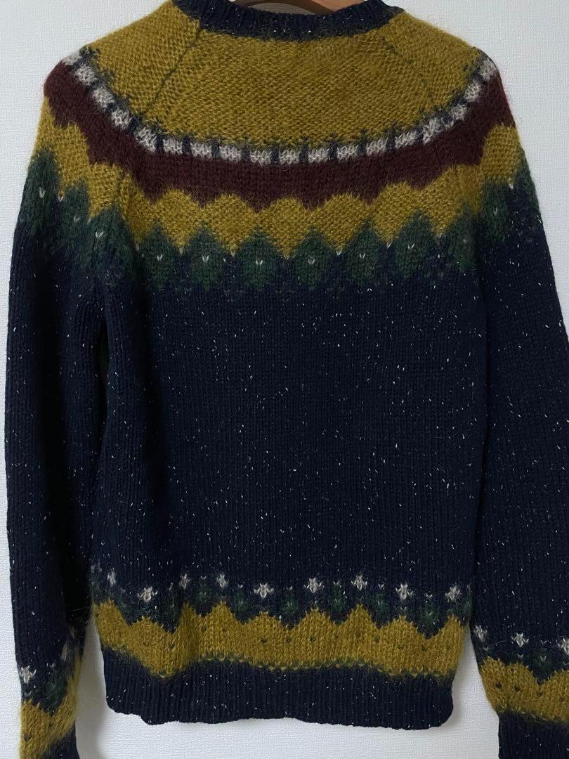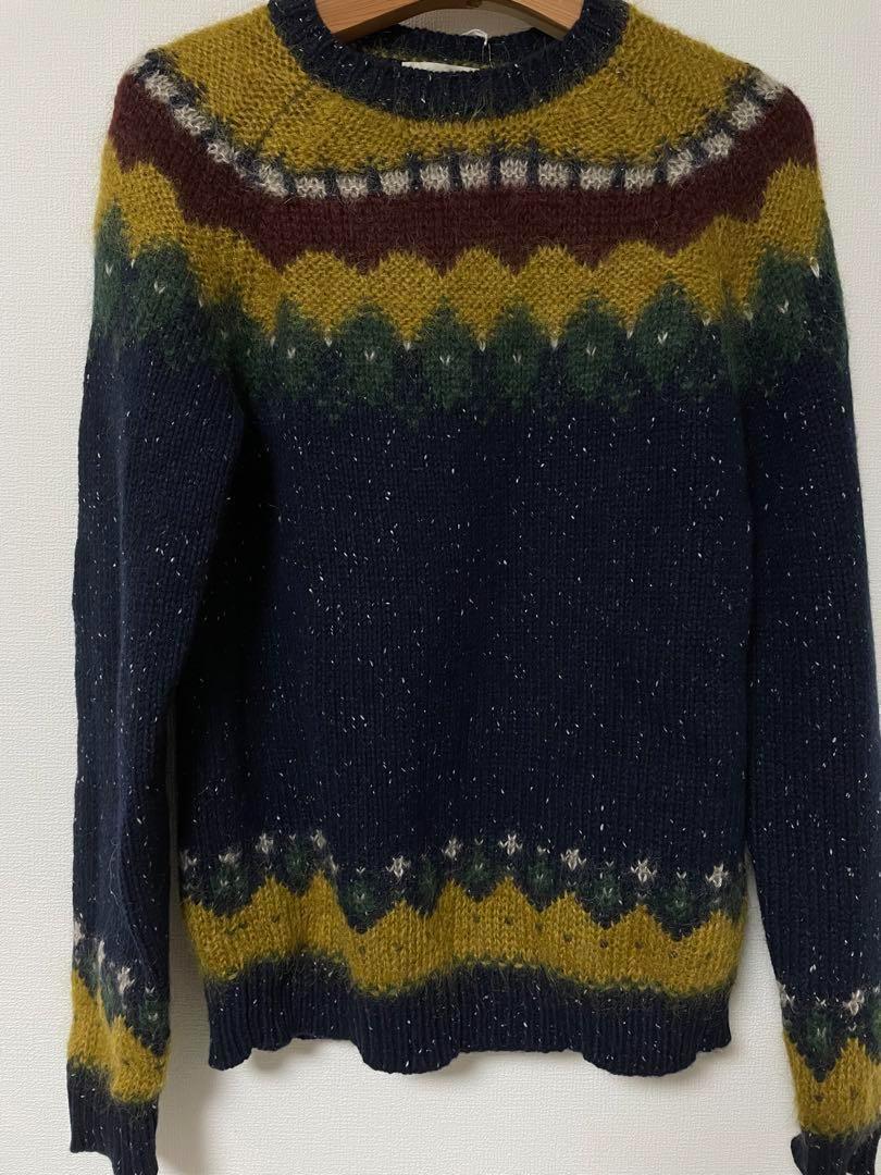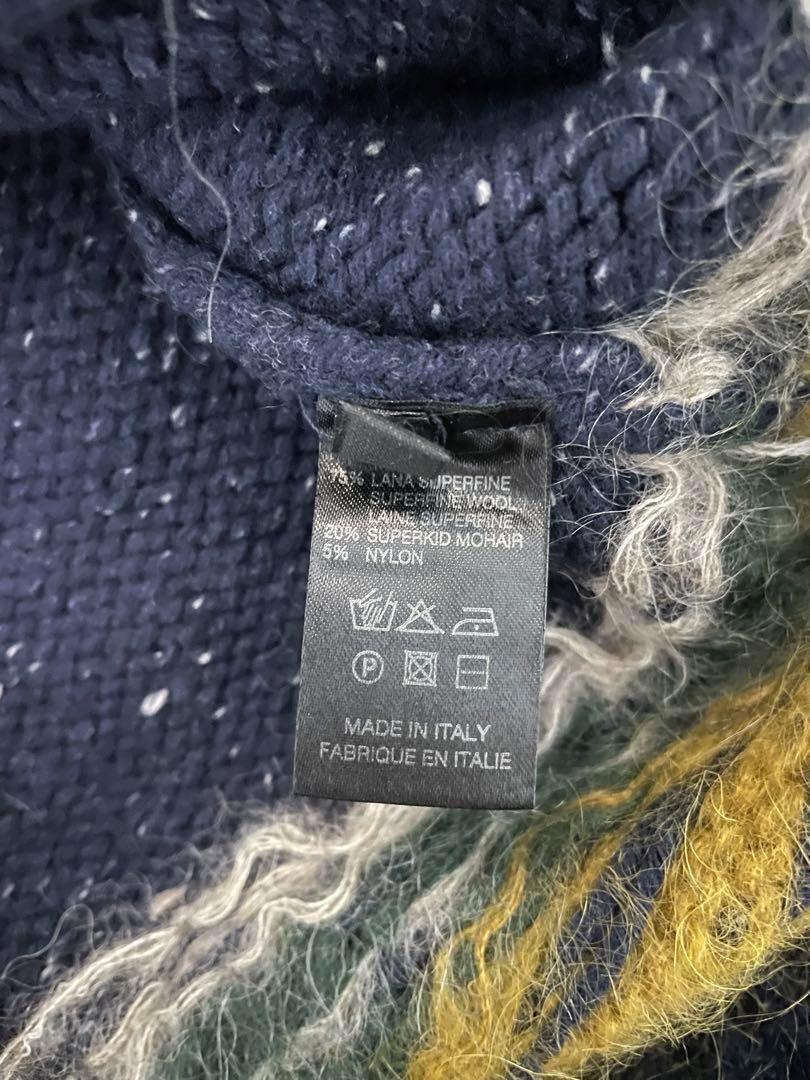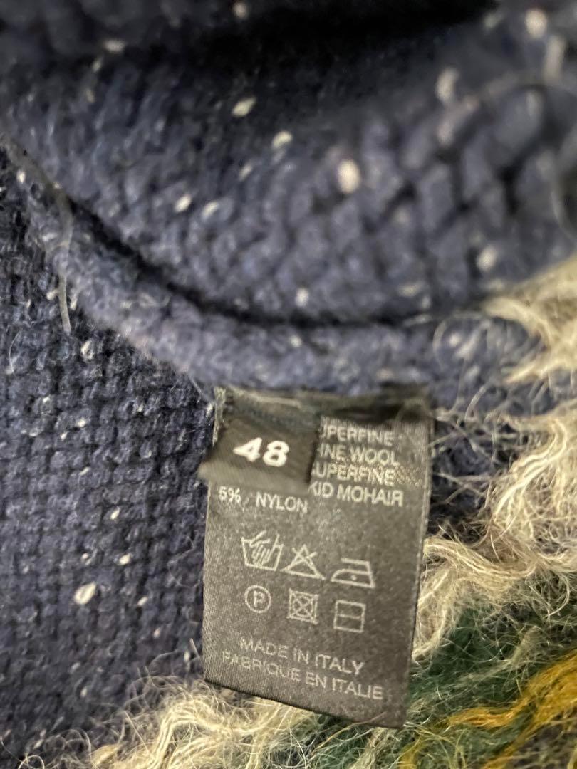 ネイビー部分がウールで、他の色のところが毛足が長いのでモヘア/モヘア混紡と思われます