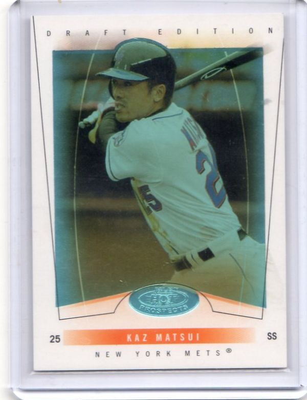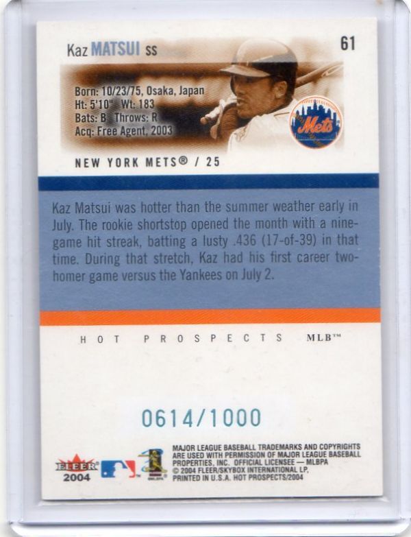 2004FLEER HOT PROSPECTS DRAFT EDITION #61 シリアルNo.0614/1000枚限定 松井稼頭央 MLBルーキー・カード ---------------------------------------------------- ■松井稼頭央 MLB成績 7年 2004-10年 メッツ ロッキーズ アストロズ 630試合 615安打 32本塁打 102盗塁 打率.267 2007年 32盗塁=リーグ9位 カズオ・ファンの方、是非どうぞ! |