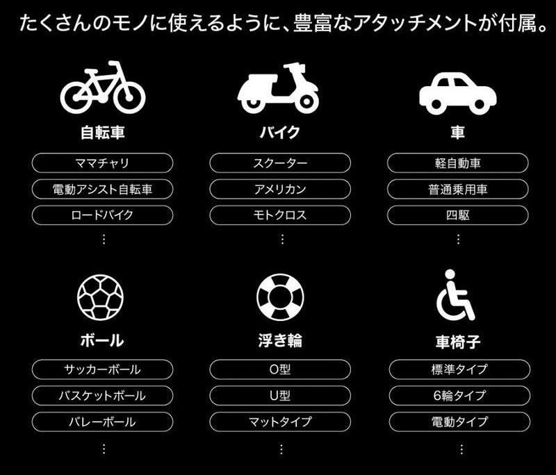 アタッチメントとして自転車につけるためのトンボ口アダプターも(他、ボール用アタッチメント等)