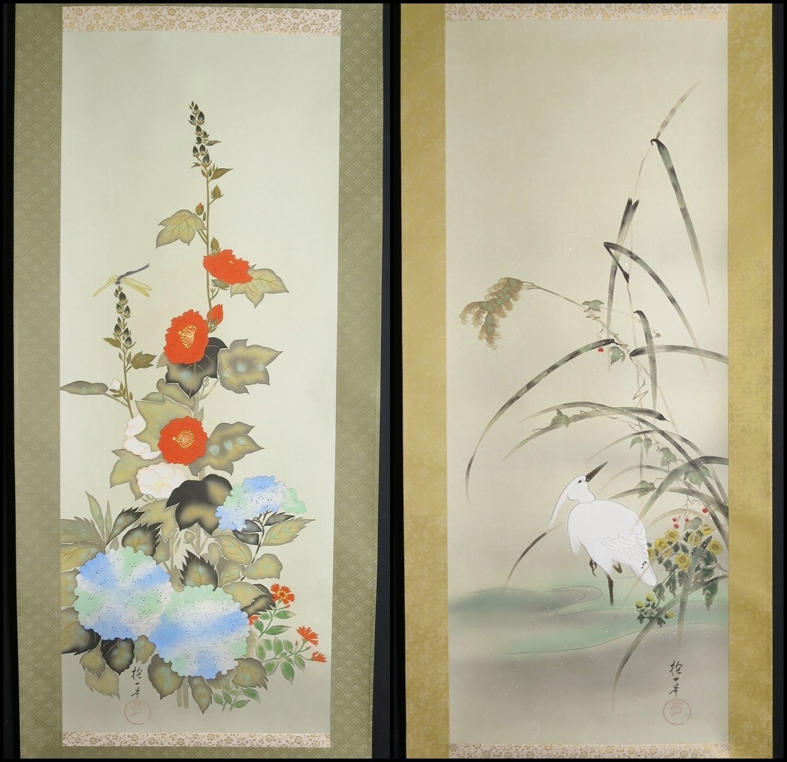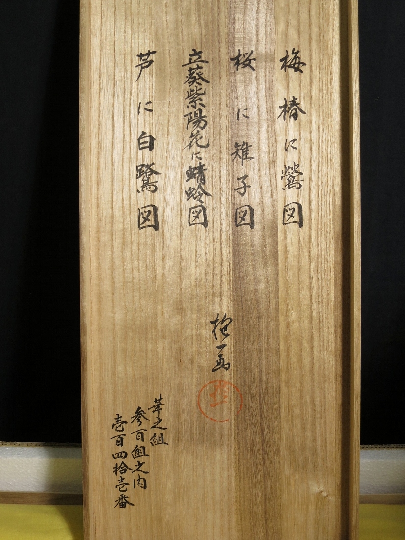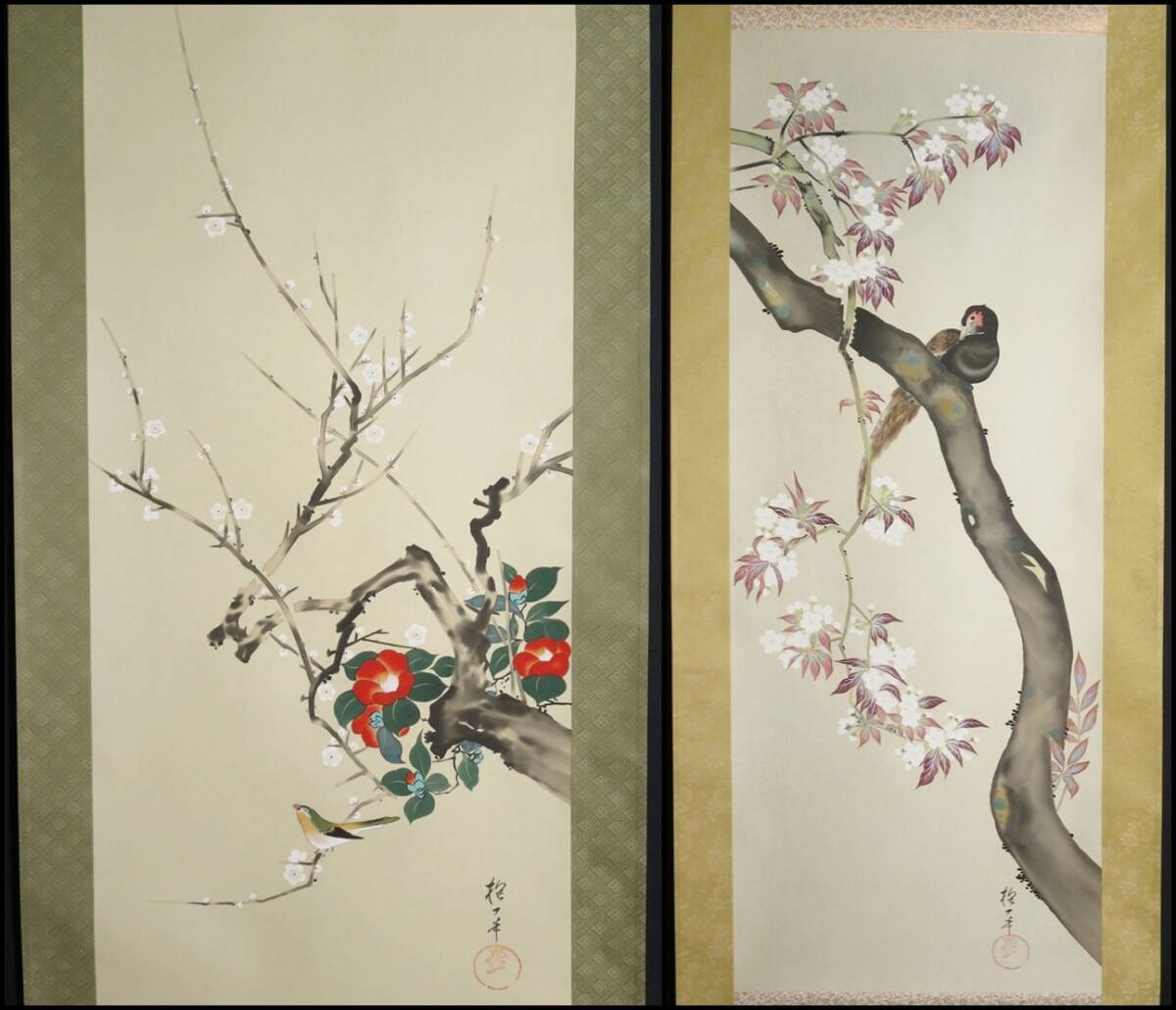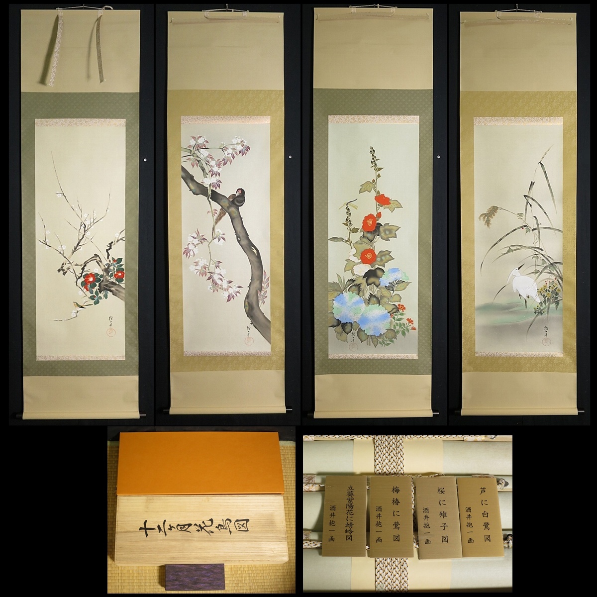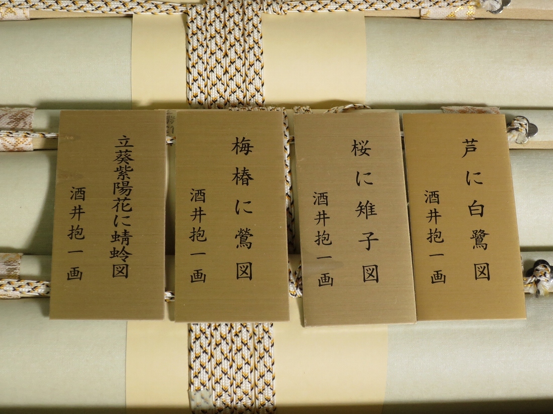 【真作】1250【掛軸】酒井抱一『十二ヶ月花鳥図』4幅対 共箱 高級美術印刷一部手彩色 画題プレート 工芸