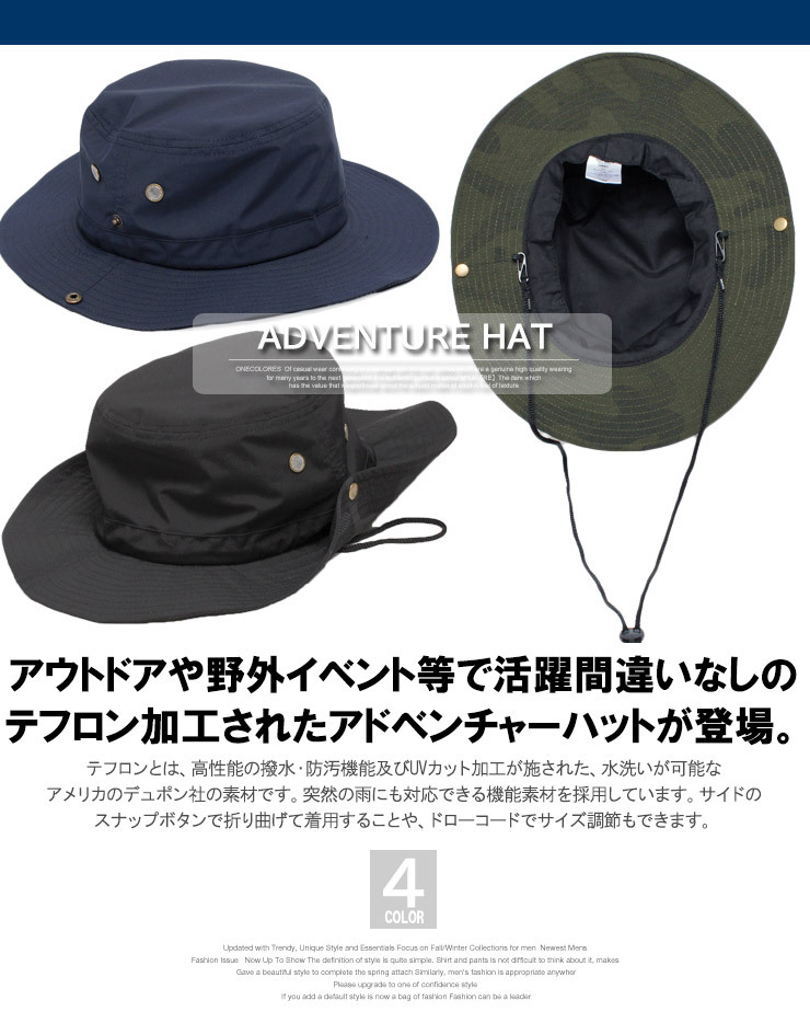 | 商品説明 | アウトドアや野外イベント等で活躍間違いなしのテフロン加工されたアドベンチャーハットが登場。 |