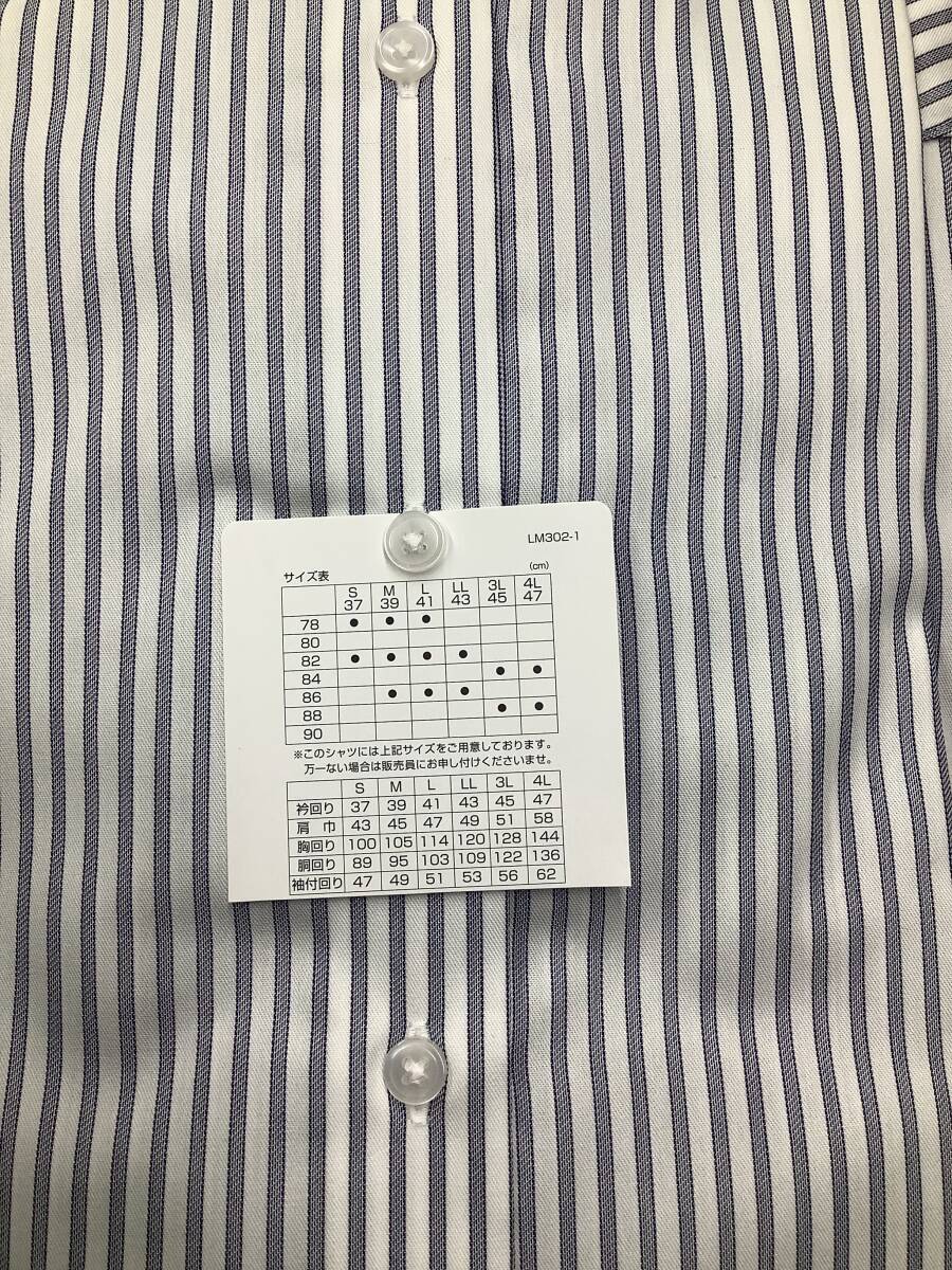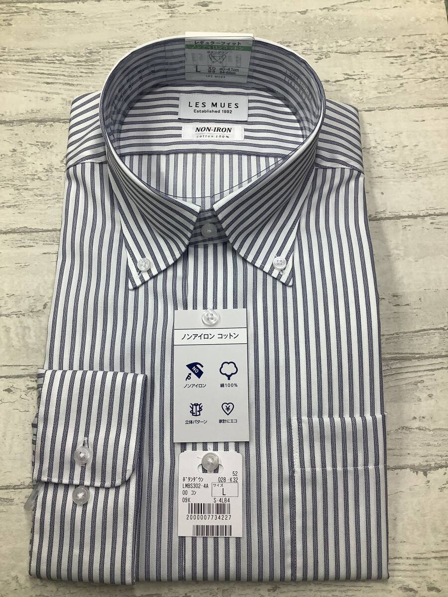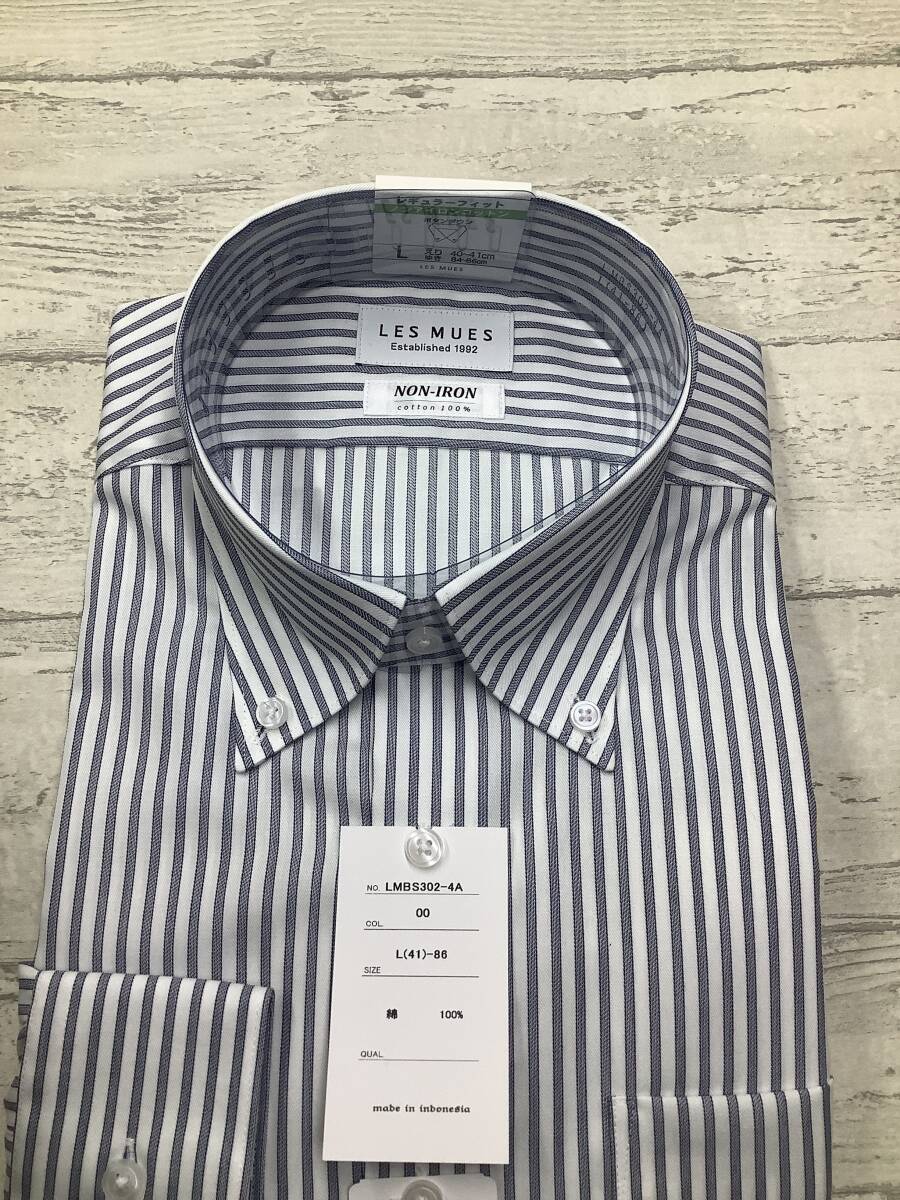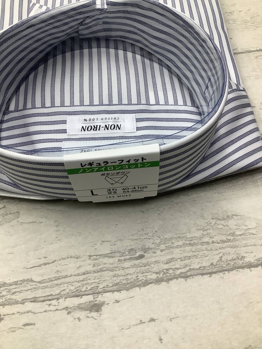 新品未使用 41-86 ワイシャツ長袖 Lサイズ ボタンダウンカラードレスシャツ ノンアイロンコットン 綿100% 白×ネイビー系ストライプ