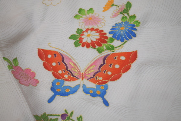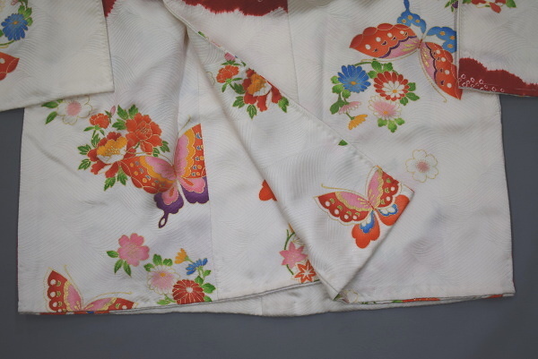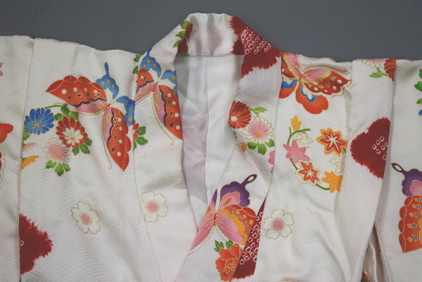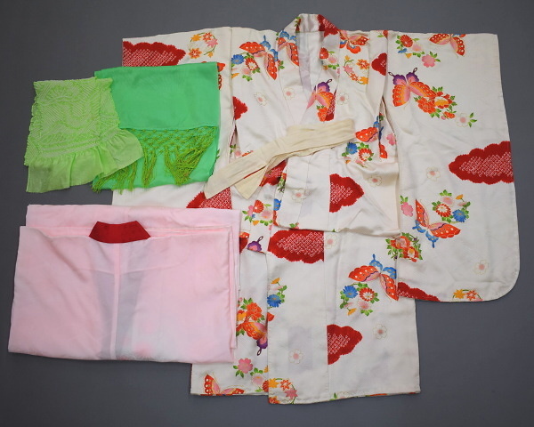 A06-2【凛々】即決 中古品 正絹 女児 七才用 四ツ身 白 雲 花 帯揚げ しごき 長襦袢付