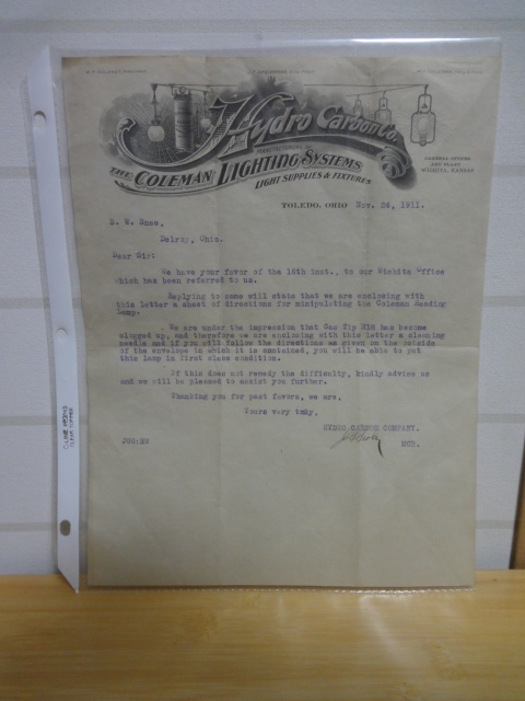 コールマン テーブルランプ モデルRのパーツリスト 取説 手紙(1911/11/24)