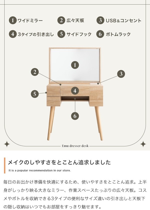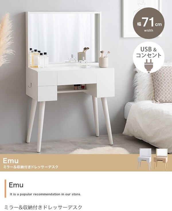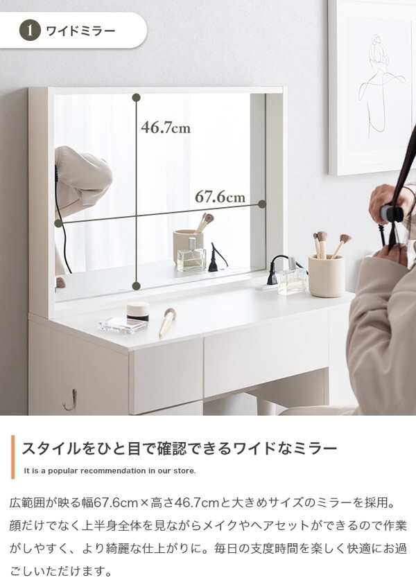※現在ご覧の商品ページはホワイトのご購入ページとなります。 ヤフオクの仕様上単一ページに複数バリエーションを掲載することができませんので、他バリエーションが希望の場合は別ページでご購入お願い致します。 大きな鏡と広い作業スペースでのびのびメイクが叶う『Emu(エミュ)』ドレッサーデスク。 大きな鏡と大容量の収納スペースは、ヘアセットやメイクアップを効率よく進めることができ、毎日の忙しい朝にもピッタリ。 毎日のお出かけ準備を快適にするため、使いやすさをとことん追求しました。 ドレッサー空間を自分だけのお気に入りの場所に変え、心安らぐメイク時間をお楽しみください。 配達業者を指定いただくことはできません。 沖縄・離島に関しましては、別途配送料が必要となります。 北海道への配送も別途配送料が必要になる場合がございます。 ※別途送料が発生する場合は後ほどご連絡させていただきます。 タイミングによっては在庫切れの場合があります。