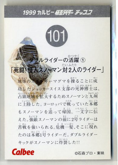 | ◆防水対策 厚紙補強 カルビー 仮面ライダーチップスカード(1999 復刻版) 101番 ダブルライダーの活躍・1 「死闘!怪人スノーマン対2人のライダー」 トレカ 即決 | |