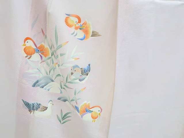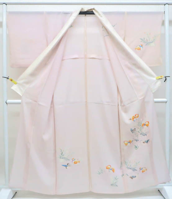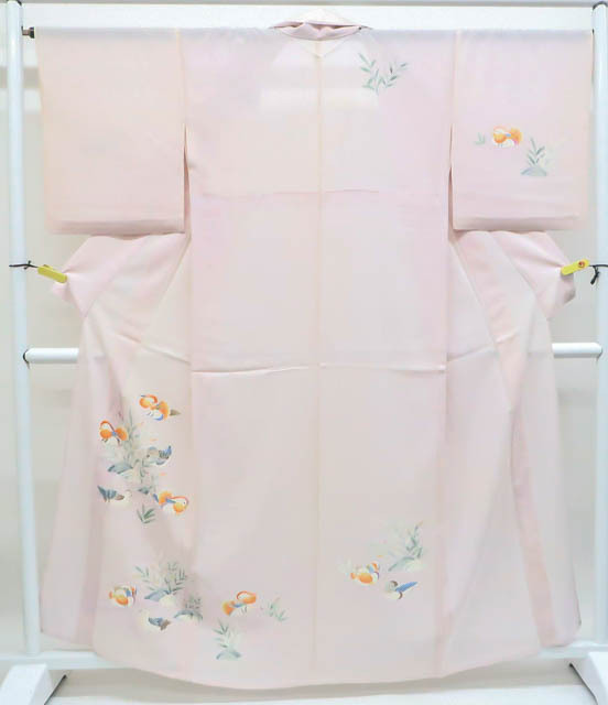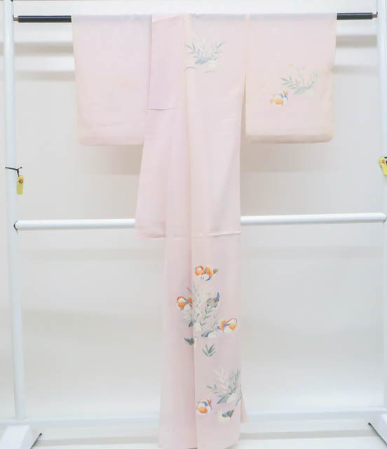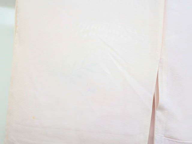 リサイクル商品のため、上前身頃や衽に点シミ、袖口や袖にシミ、袖、縫い目に薄ヤケがございます。 地色は、紫のあるピンクです。 1枚目の画像が近いお色かと思われます。 素材は正絹です。 |