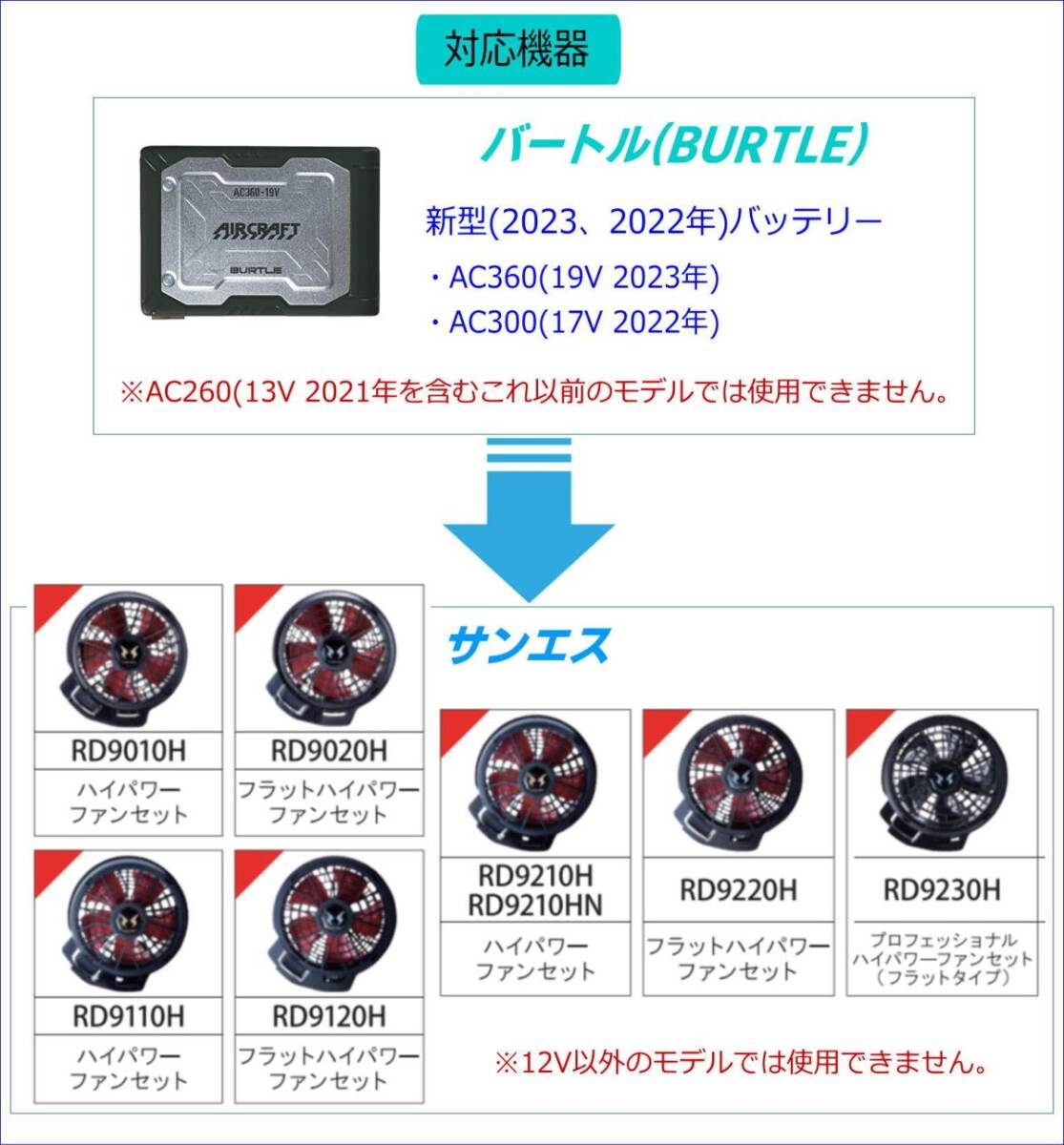 □サンエスのミドルクラスファンを強力、急速充電可能なバートル バッテリーで使えるようになります。