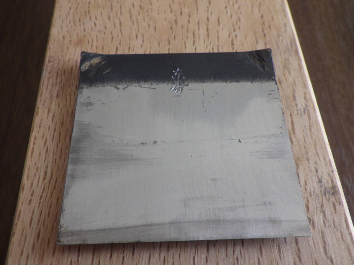 ①刃 全長11.1㎝、身幅カエサキ付近で6.6㎝、鋼丈5㎝、厚み頭部8㎜鎬筋㎜です。地金は極軟鋼、鋼は青紙です。頭部のまくれを修正し、鎬面と裏スキ以外を黒染めしてあります。