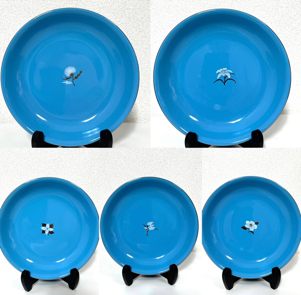 水色と白の地に、中央には金彩をあしらった四季の花々(たんぽぽ・牡丹・桜・菖蒲・百合)が描かれています。