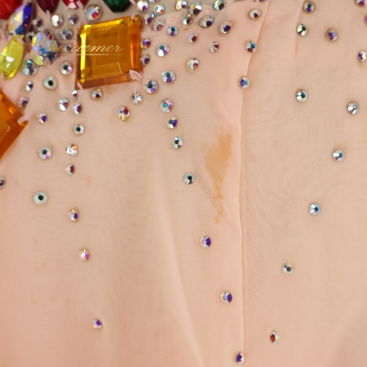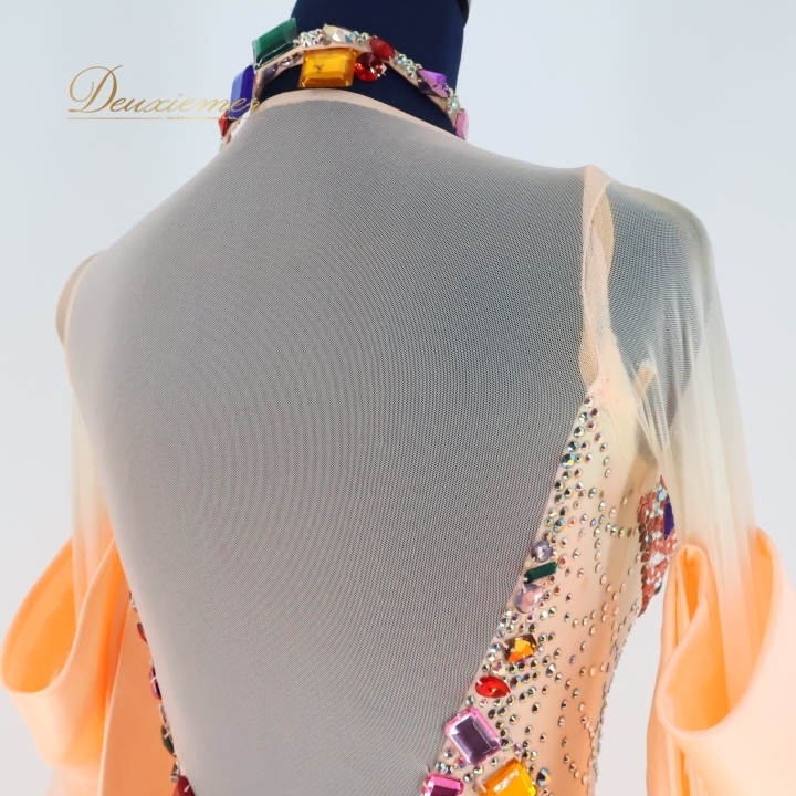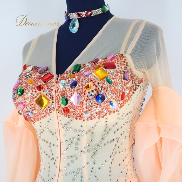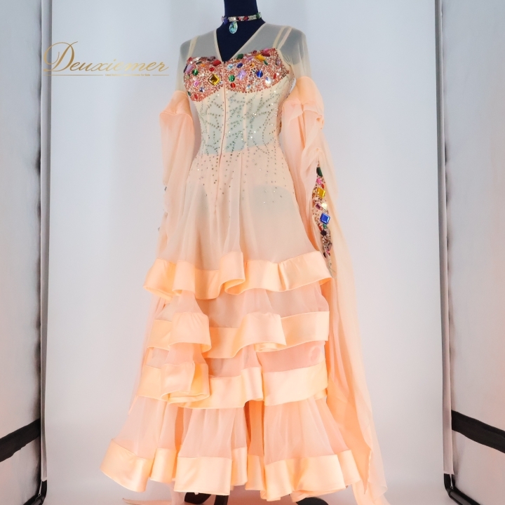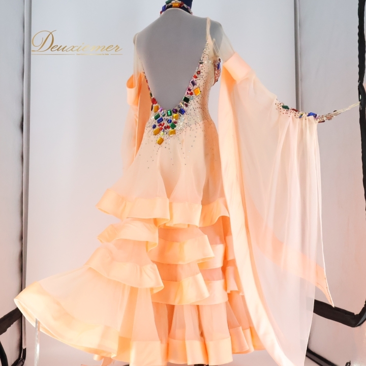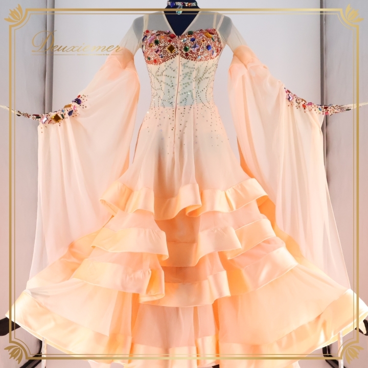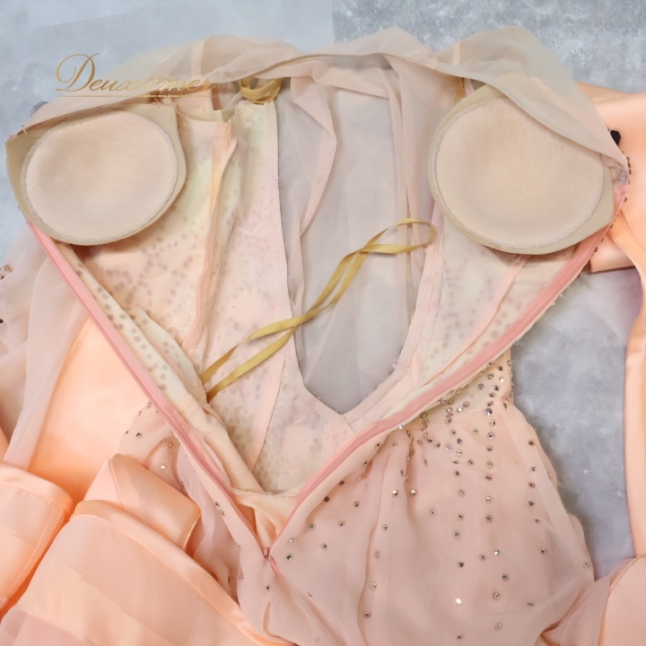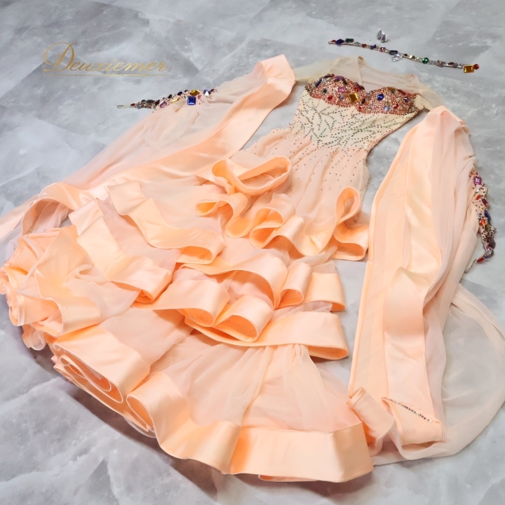 | 【商品名】社交ダンス 衣装 ワンピース ドレス 【サイズ】表記無し 平置き実測:総丈約130cm(裾~肩部まで)、身幅約35cm、ウエスト約27cm~ ※実測の為、多少の誤差はご了承ください ※9号のトルソーに少々窮屈なサイズ感です 【仕様】 ・正面ファスナー仕様 ・レオタード(ボタン)仕様 ・上半身のみ伸縮性有り ・肩パッド無し ・胸パッド有り ------------------------------------ 【ポイント】 ▽明るめのサーモンピンク系の色味 ▽正面ファスナーで着脱しやすい ▽ホースヘアのついた段々がかわいいデザイン ------------------------------------ 【撮影時使用トルソー】 種 類:女性用トルソー9号 (一般的に使用されるサイズです) サイズ:肩幅約37cm、バスト約88cm、ウエスト約66cm、ヒップ約89cm |