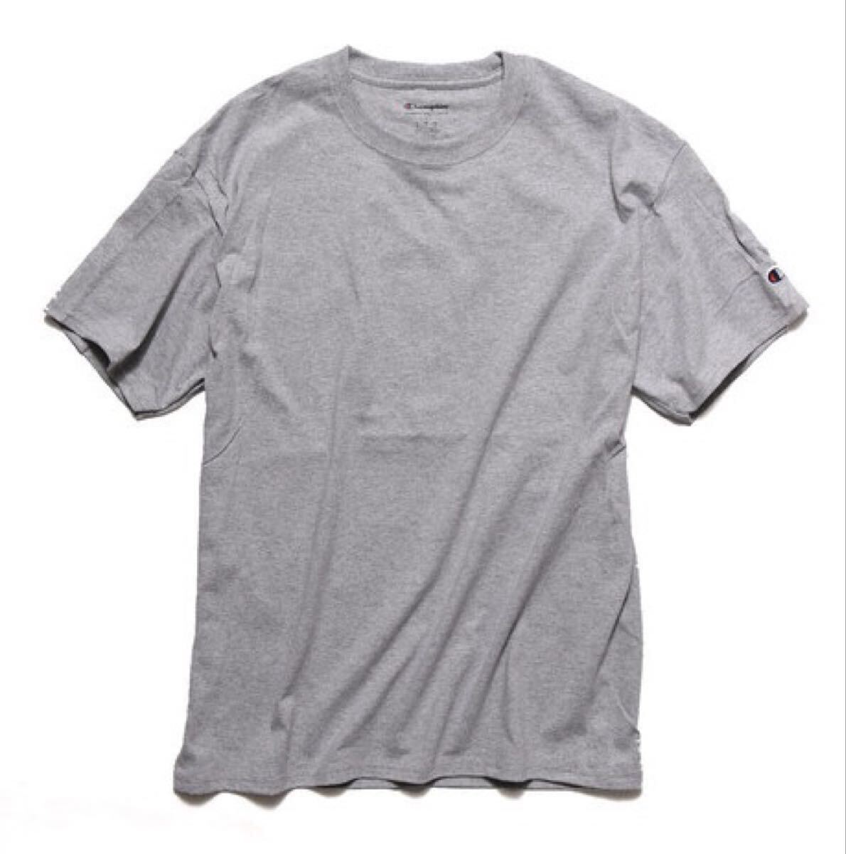 ・無地Tの中に左袖にワンポイントで施したチャンピオンのロゴワッペンが良いアクセントに