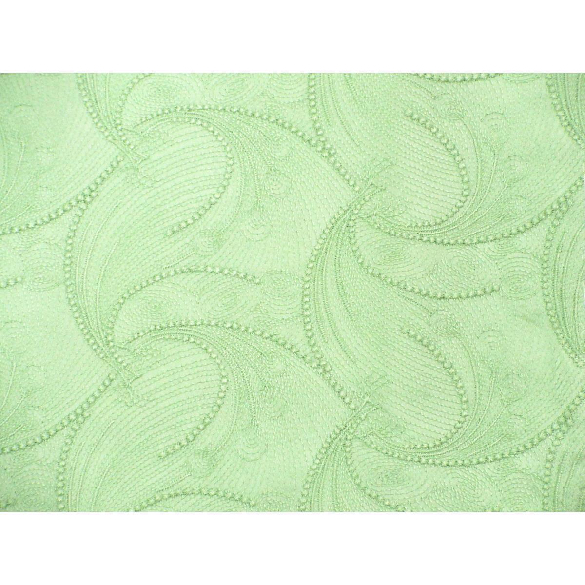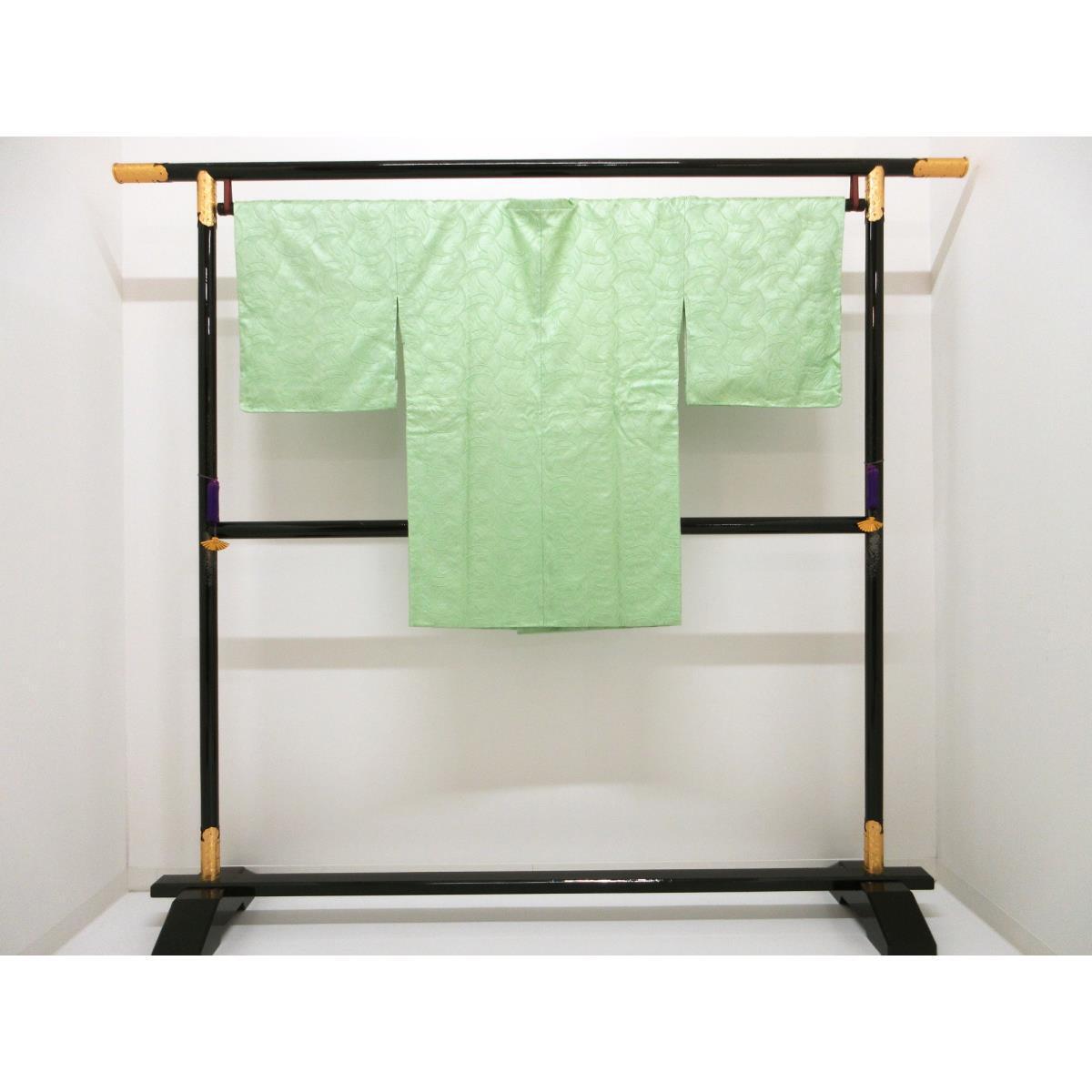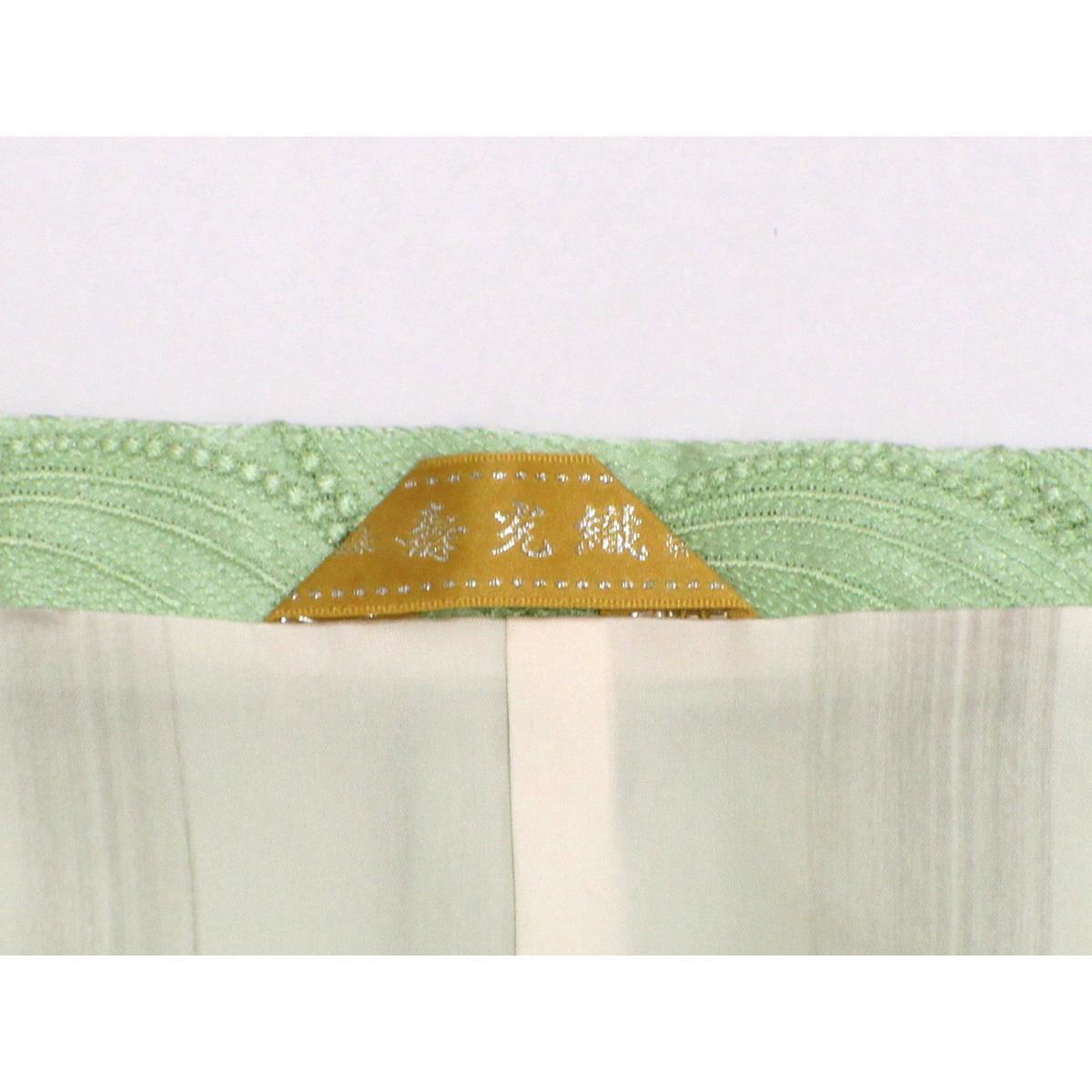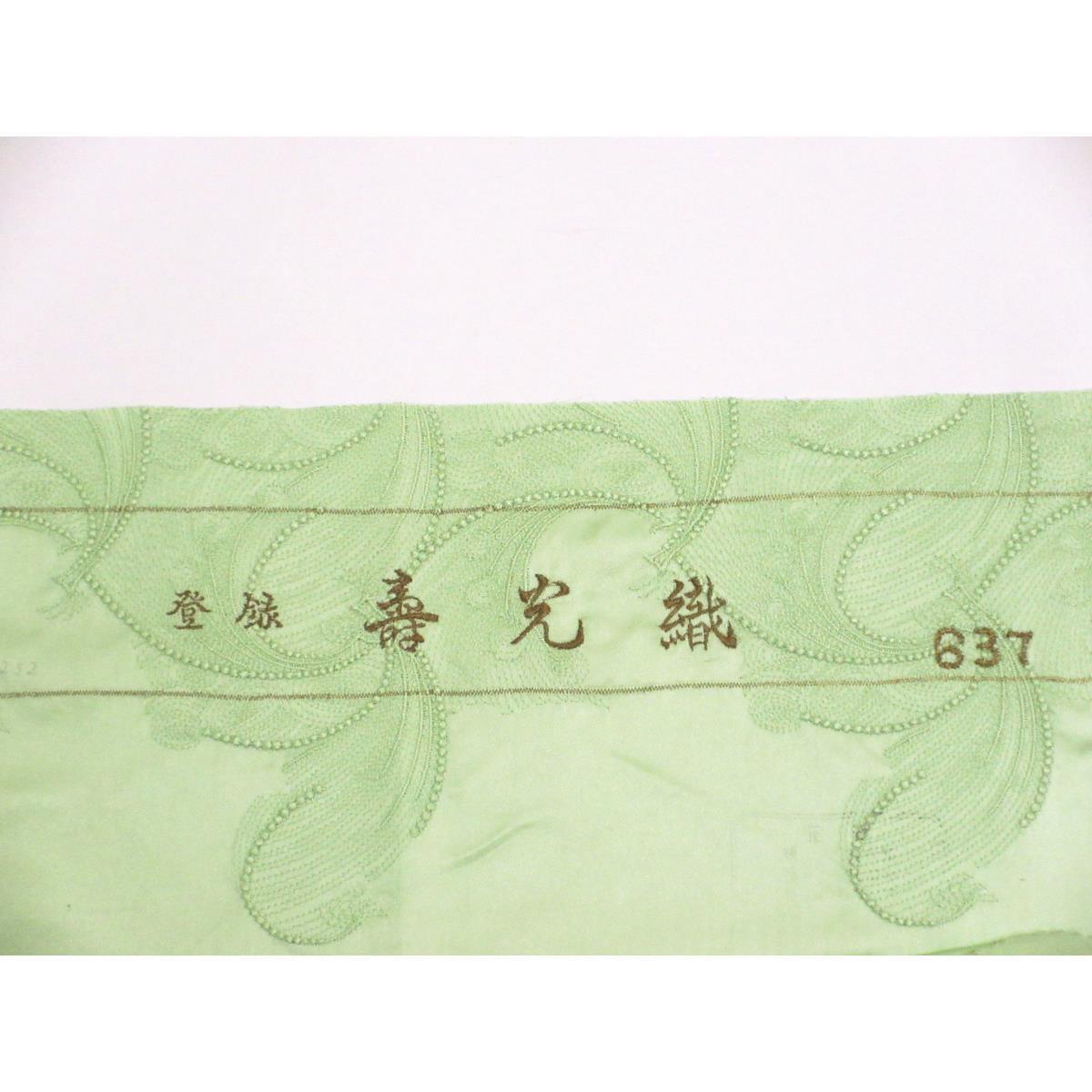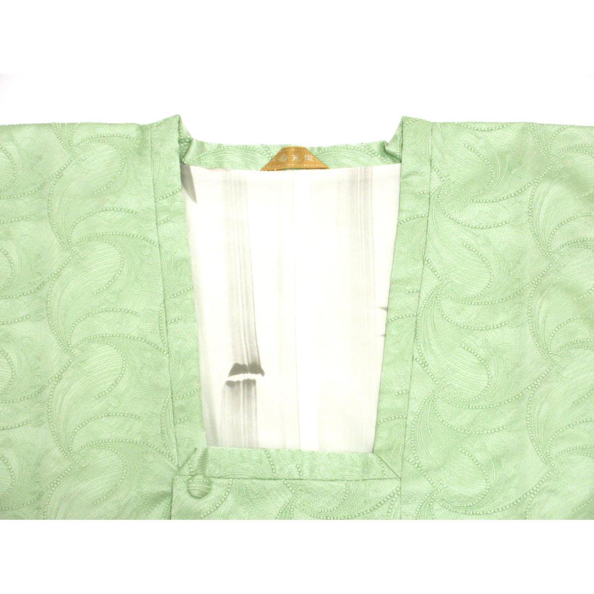 明るい薄緑色の道行コートです。孔雀の羽を図案化したような地模様で、立体的で光沢のある生地が華やかな寿光織のお品です。