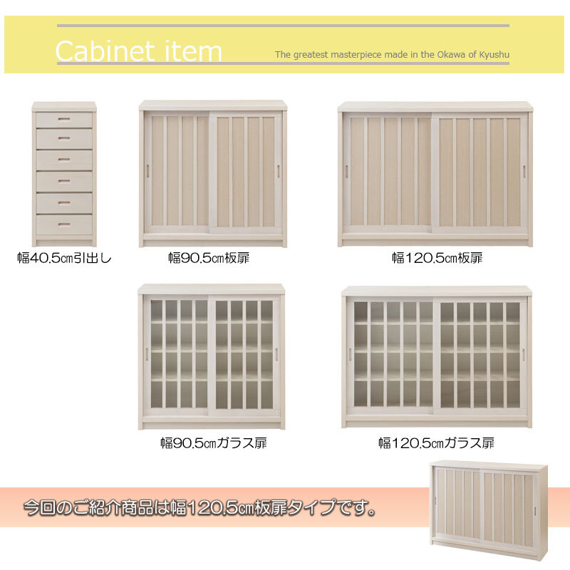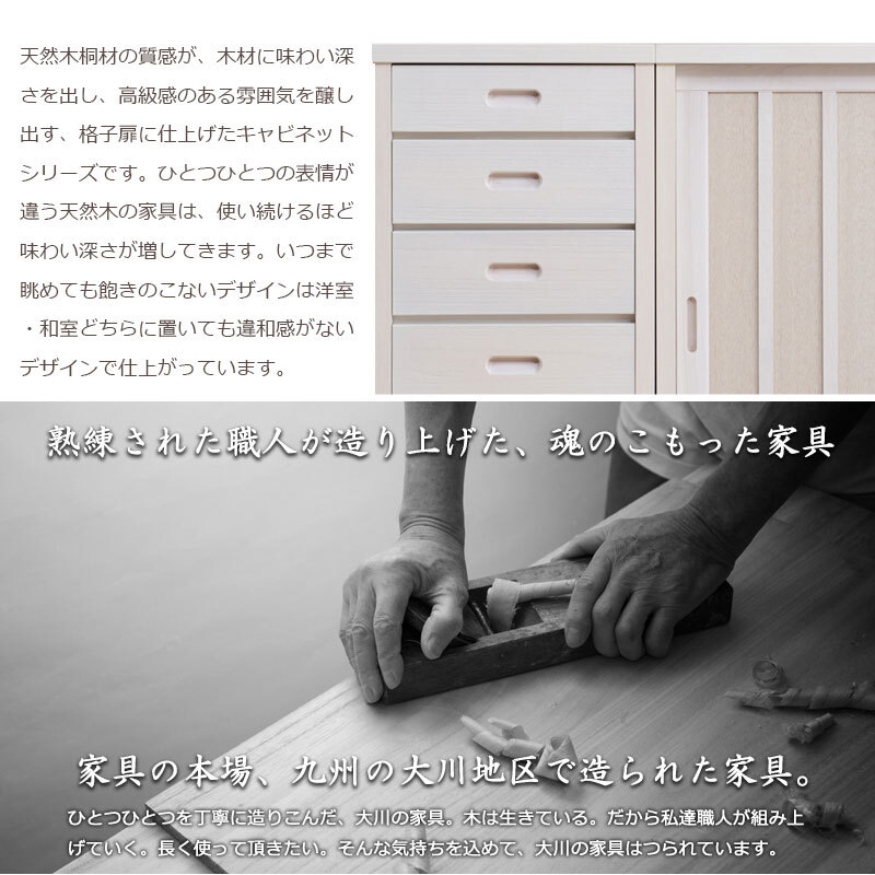 ■商品について/長く使える品質と高級感漂うデザインの【白雪】シリーズが新登場!桐の木目を引き立たせたうづくり仕上げ、職人が組み上げた、日本製の完成品ならではの洗練されたデザインが魅力的なリビングキャビネットシリーズです。和室はもちろん、洋室でも違和感なくお洒落なお部屋に演出してくれます♪2枚扉の引き戸式カウンター下収納は、すっきりとした仕上げがリビングに置いても飽きのこないデザインになっています。開き扉の商品では、開閉のために必要なスペースが扉の幅分必要になってきますが、引き戸式ならわずかなスペースでOK。取り出し易い引き戸式で前のスペースが狭くなっても、使い易くなります。また棚板の高さを変えて様々な物の収納ができます。リビングには案外収納する物が溢れています。CDやDVDを収納したり、アルバムや眼鏡ケースなど小物の収納にも便利です。また、棚板を止める金具は特殊な金具を使い、設置すると落ちにくい構造になっています。他のシリーズと合わせて、キッチンやリビングなどでお洒落に収納できます。