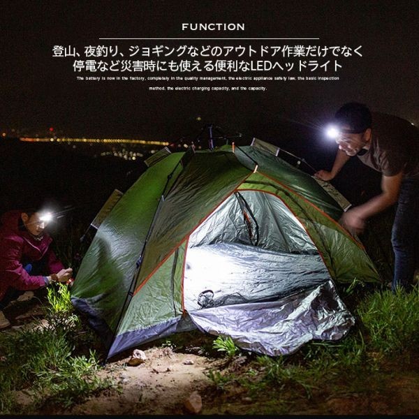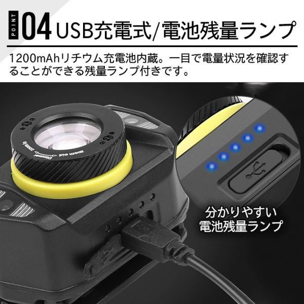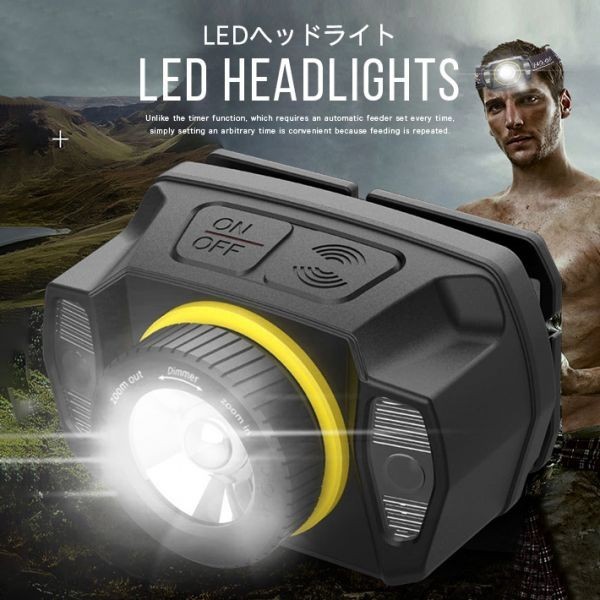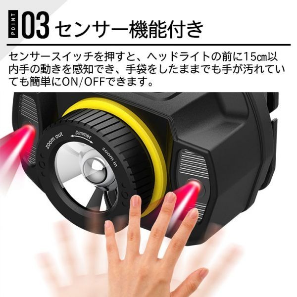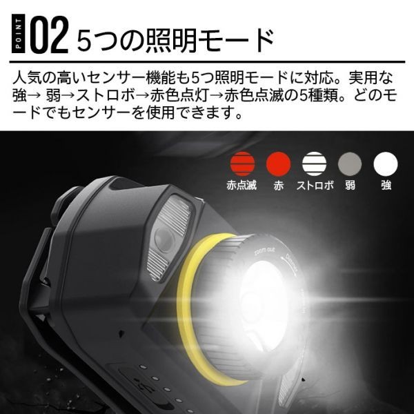 _【5つの照明モード・センサー機能付き】人気の高いセンサー機能も5つ照明モード対応で進化しました。実用な5つの照明モード:強→ 省エネ→ストロボ→赤色点灯→赤色点滅。どのモードでもセンサーを使用できます。センサースイッチを押すと、ヘッドライトの前に15B以内手の動きを感知でき、手袋をしたままでも手が汚れていても簡単にON・OFFできます。両手自由になって、登山、夜釣り、ジョギングなどのアウトドア作業だけでなく、停電など災害時にも安心のLEDヘッドライトです。
