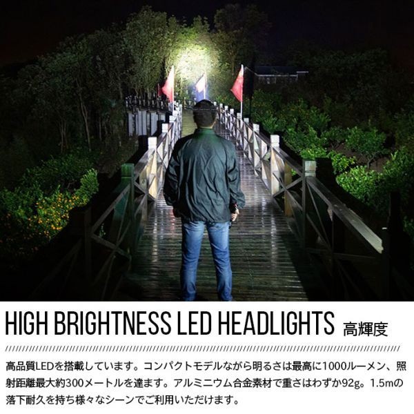 【高輝度LED・ズーム機能】高品質LEDを搭載しています。コンパクトモデルながら明るさは最高に1000ルーメン、照射距離最大約300メートルを達ます。ズーム機能は3つの照明モードを対応でき:強→ 省エネ→ストロボ。照射範囲は拡大または縮小できます。ディマーを左右に回転してワイドビーム/スポットビームが切り替えます。夜でも300メートル以外の物体に焦点を合わせることできます。照射距離は十分遠くて高輝度なので登山や夜間作業に威力を発揮します!