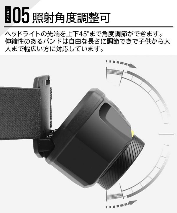 _【軽量・長さ&照射角度調整可】アルミニウム合金材料で作られて、92g軽量だけではなく、1.5mの落下耐久を持ちます。夜釣り、登山などの時にライトを長時間装着しても頭が痛くなりません。伸縮性のあるバンドが自由な長さに調節できで子供から大人までお気楽に使えます。ヘッドライトの先端を上下45°まで照射角度調節できます。使用環境によって、適切な照射角度を調整でき、夜散歩、耳掻き、歯のヤニ取りの時に便利です。照射周囲を広く照らし、危険がよく避けられます。