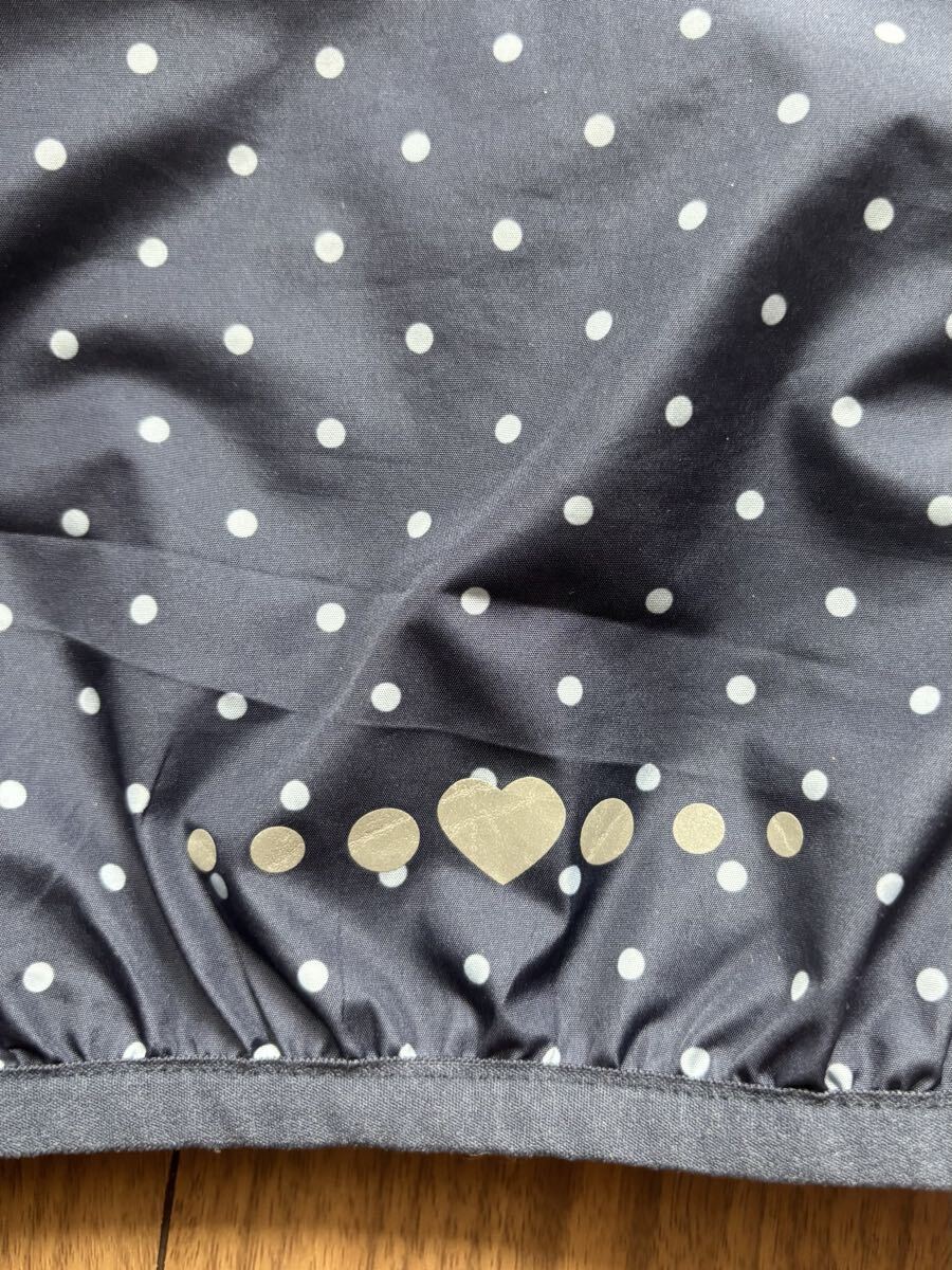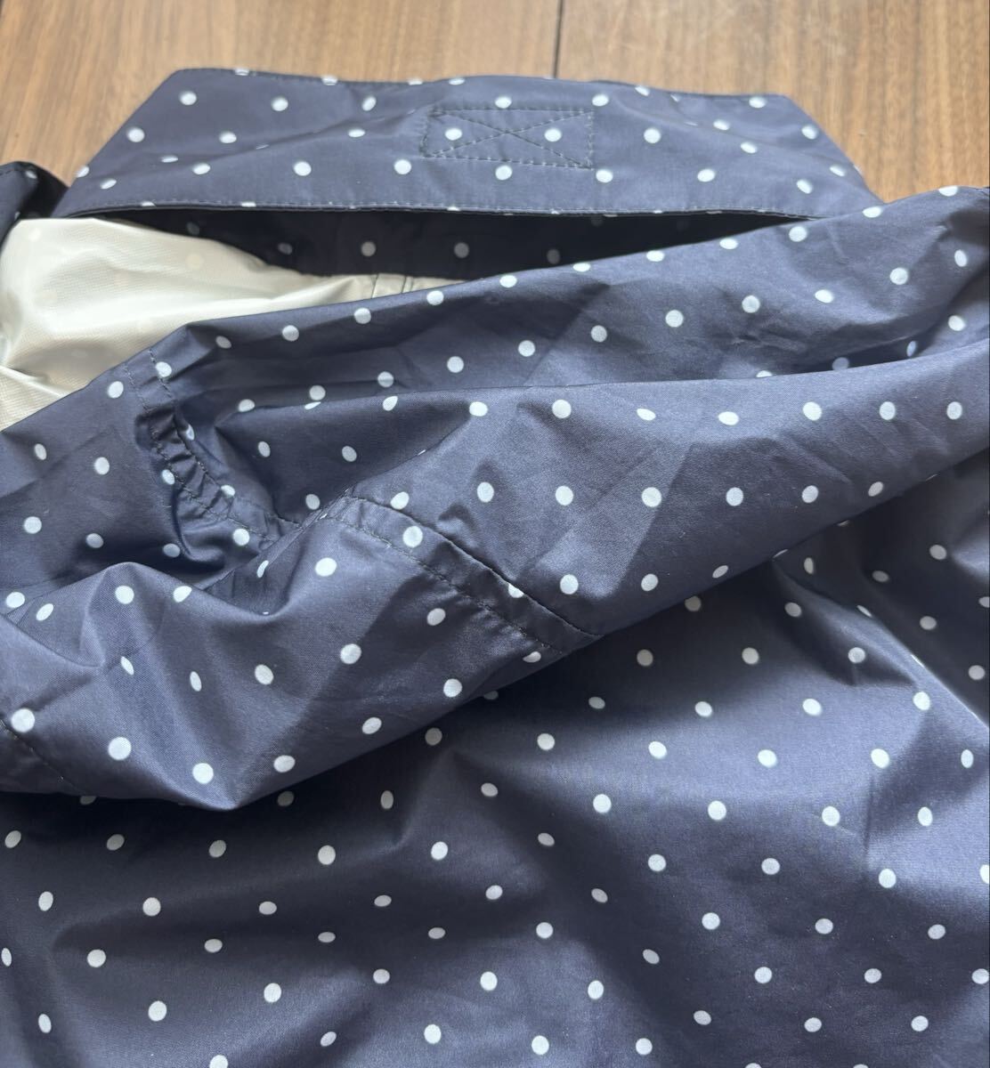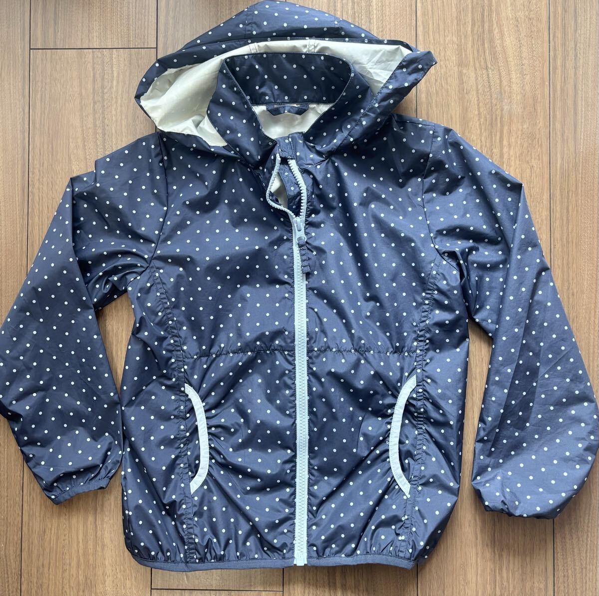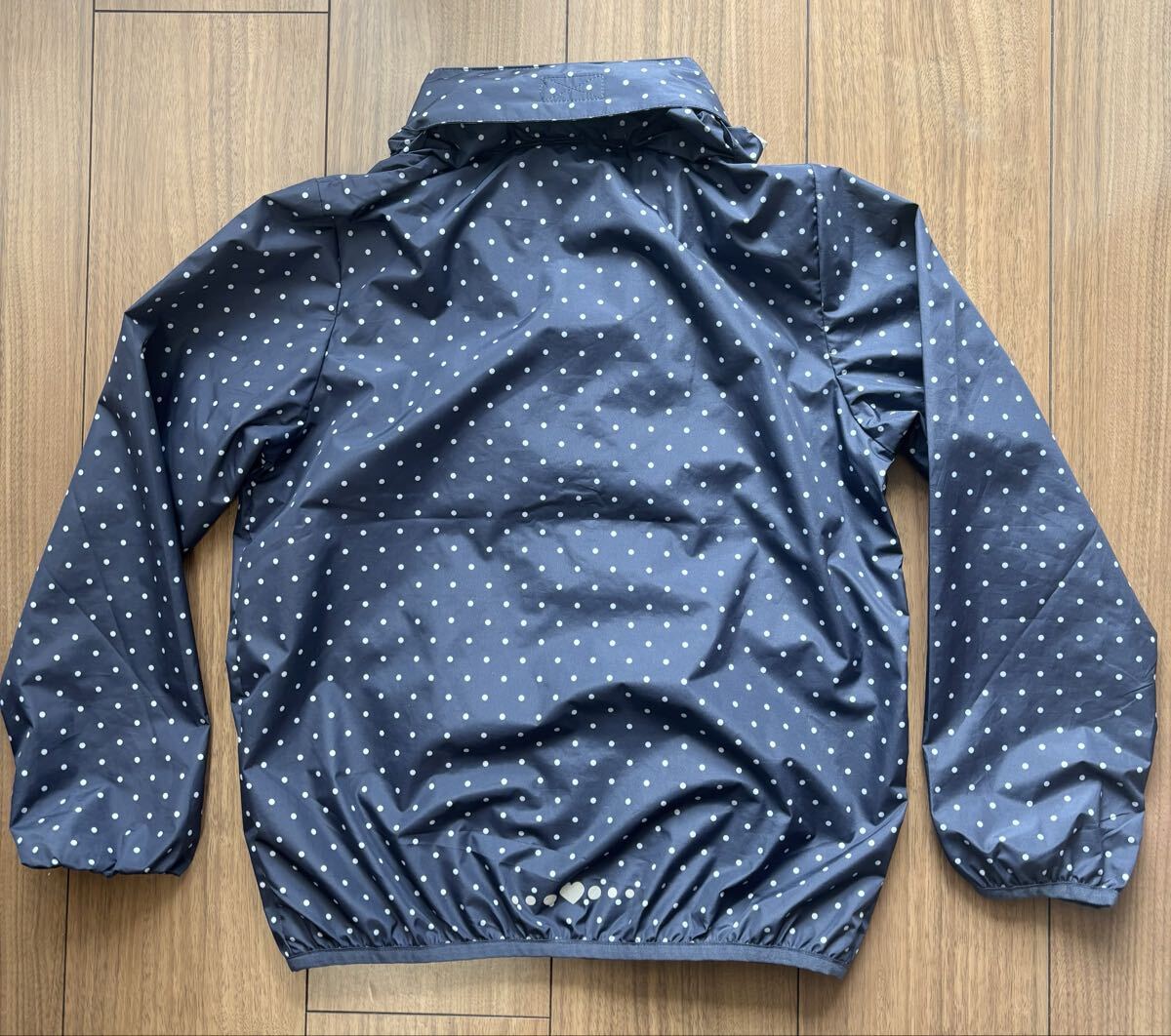 使用頻度は少な目で目立つ傷や汚れは見当たりません。フードは取り外しできませんが襟の中に収納できます。背中の下の方にリフレクターテープがついていますが少しスレがあります。レインコートのような生地なので雨の日の通学などに使用していただけるかと思います。お安くしておりますので見落としなどありましたらご容赦ください。