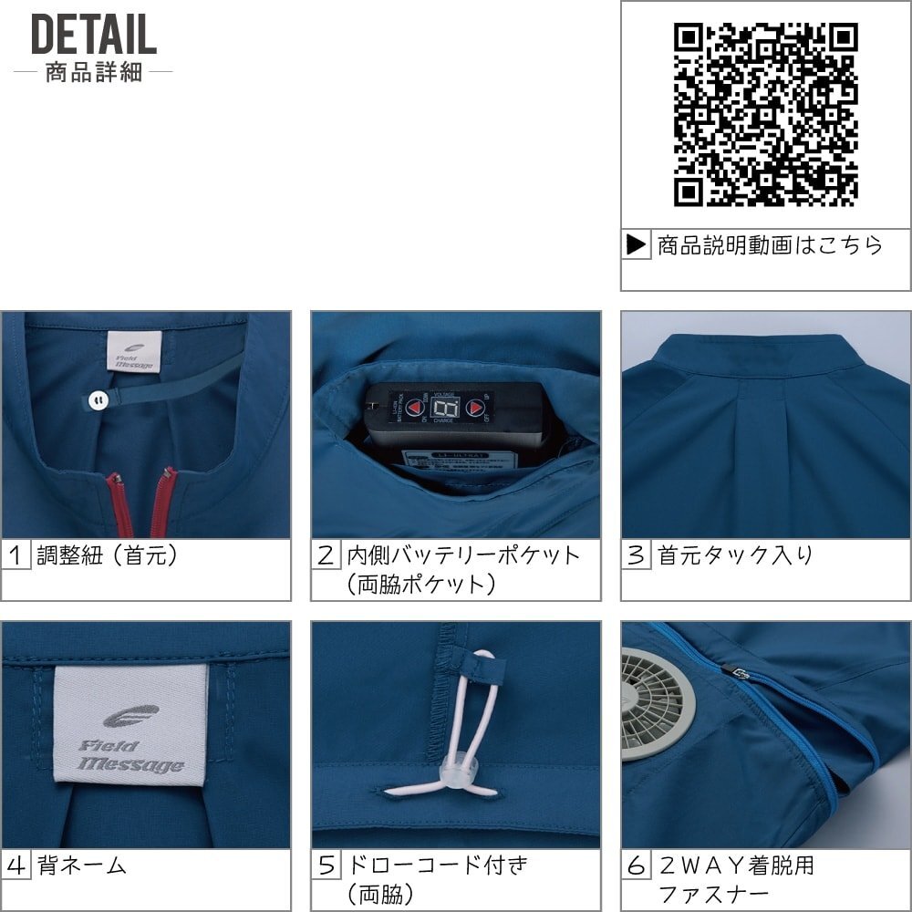 特長:調整紐(首元)/左内側パッテリー専用ポケット/保冷剤用メッシュポケット/首元タック入り/フードパンチング仕様