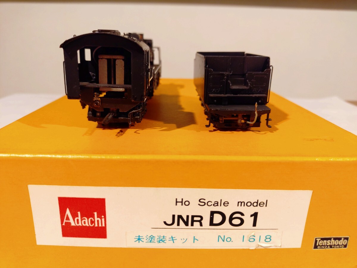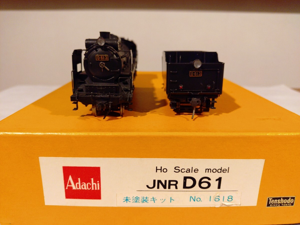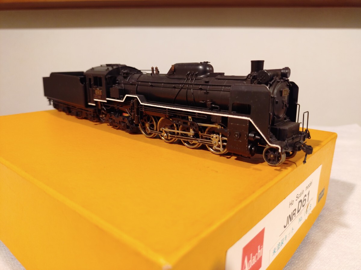 コレクション整理で出品します。かなり前に中古購入したアダチ製の蒸気機関車D61形です。未塗装キットの組み立てで元箱付きです。展示用のシリンダー棒も付属します。