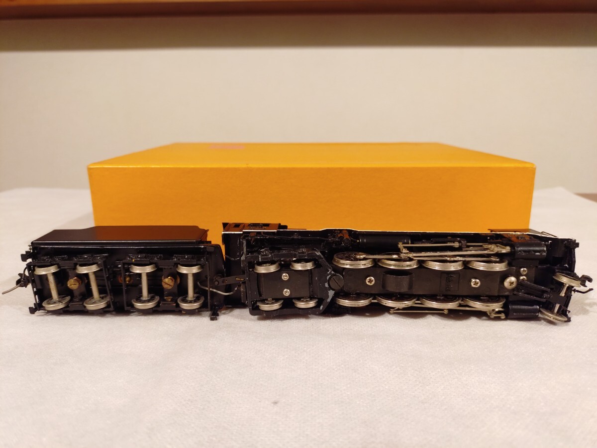旧式横軸モーターで少し音が大きいですが、走行は両方向ともスムーズです。ボイラー側とテンダー側の前照灯が前進時も後進時も点灯します。なお、テンダー側の前照灯はコードをボイラー側の端子に接続する方式です(写真3枚目)。はんだ付け方式なので、常設レイアウトをお持ちの形であれば、テンダー側も常時点灯させ易いと思います。コードはテンダー内に格納出来ますので、テンダー側を点灯させない場合も外観上の難点にはなりません。