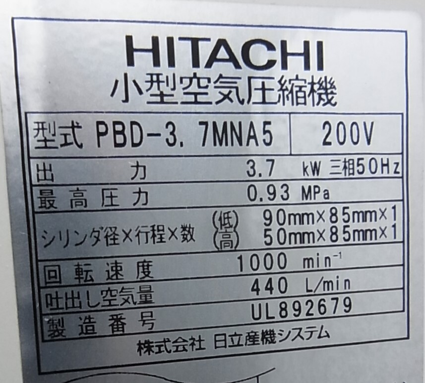 ま 日立 パッケージコンプレッサー PBD-3.7MNA5 ドライヤ付き 防音型コンプレッサー エアーコンプレッサー 空気源・予備空気・自動車