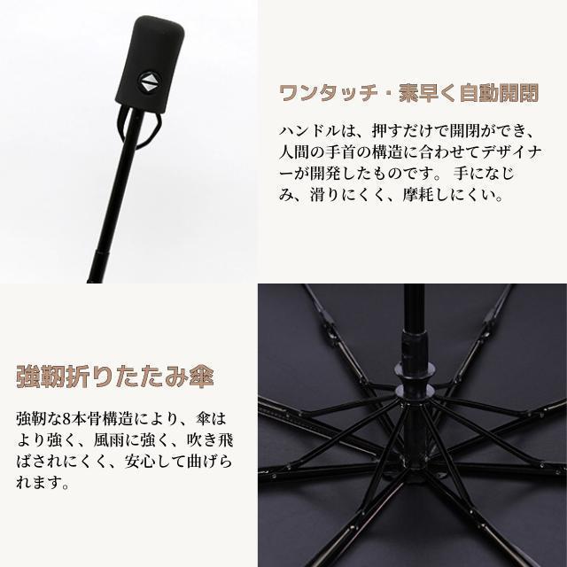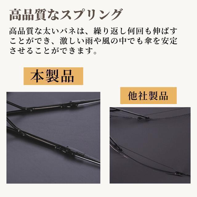 柔軟性と強度を併せ持つ8本親骨を採用し、頑丈で風に強い設計になっています。超強靭な骨組みで強い風でも簡単に折れることはありません。さ風雨による衝撃を逃し、ワンタッチで折りたためばすぐ元に戻れます。強風の日も安心な耐風傘です。