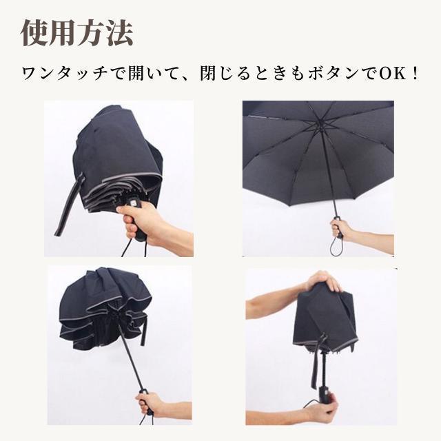 片手でカチッとボタンを押すだけで自動開閉できます。手荷物が多いとき、車やバスの乗り降りのときなどに便利な折りたたみ傘です。