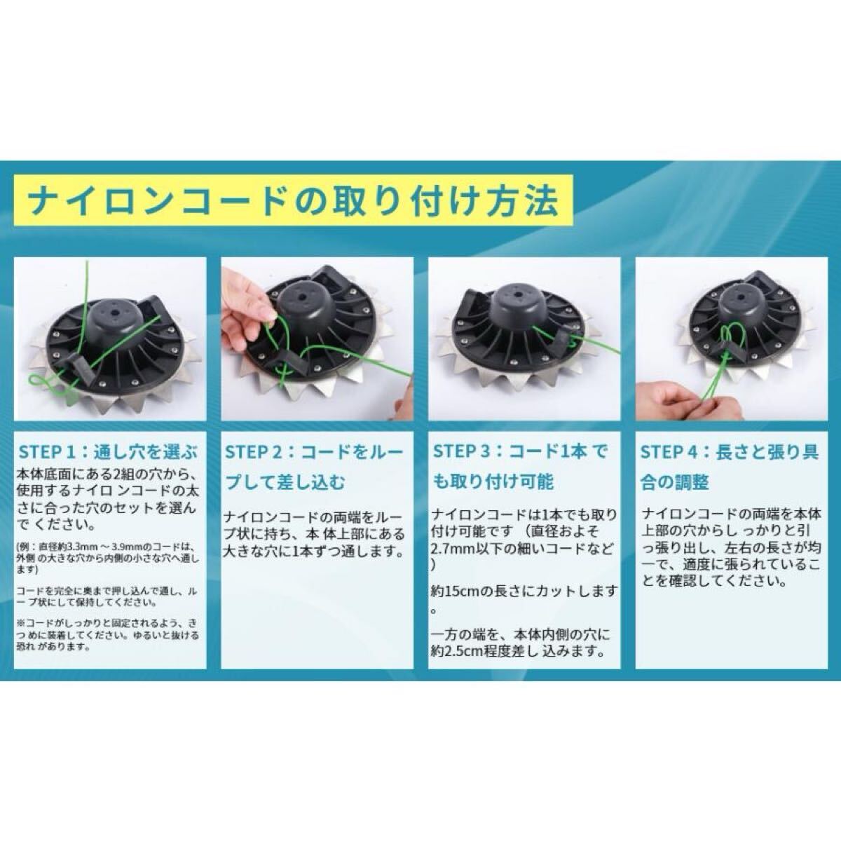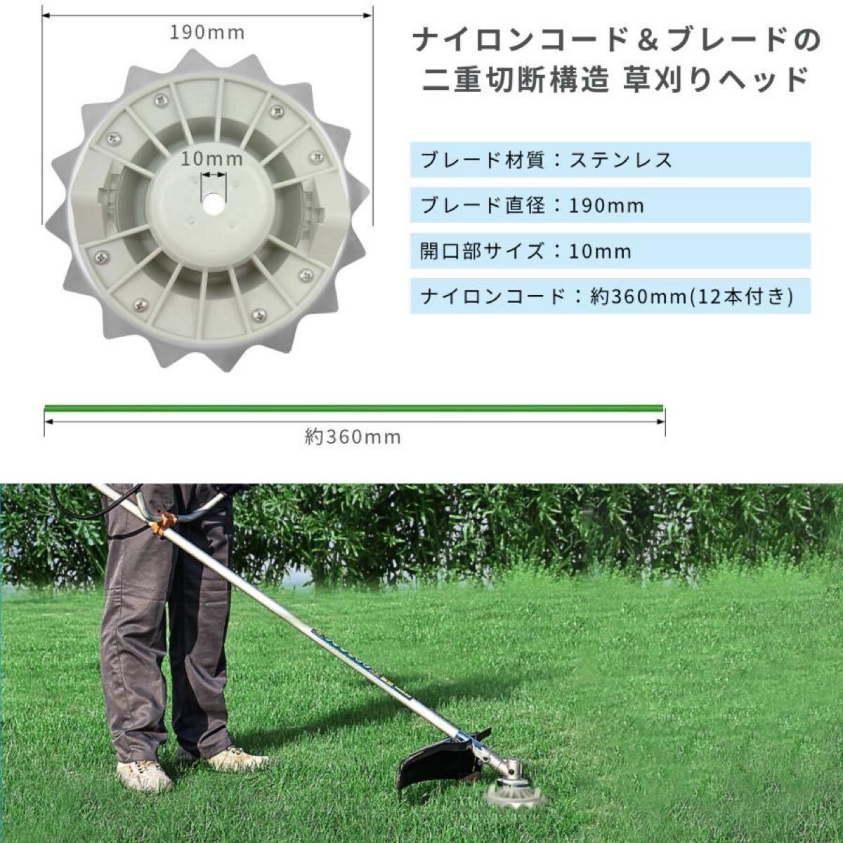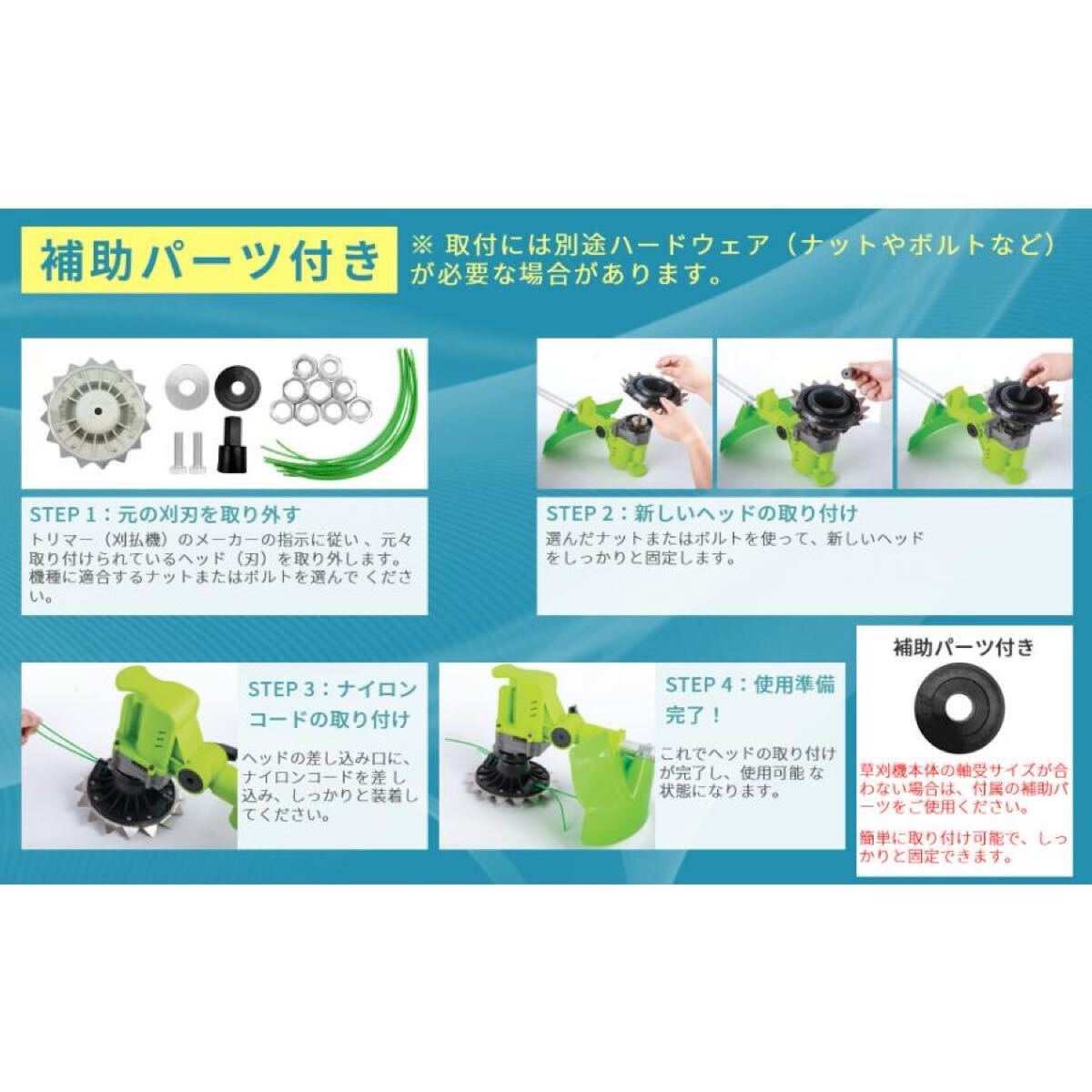 製品仕様】 ナイロンコード:12 本(長さ約 36cm/直径約 3.5mm) 替え刃:直径約 19cm/穴径約 1cm 対応機種:基本的に 21cc〜40cc のエンジン式刈払機および一部の高回転電動草刈機に適合 付属品:各種ナット(左ネジ LH対応)