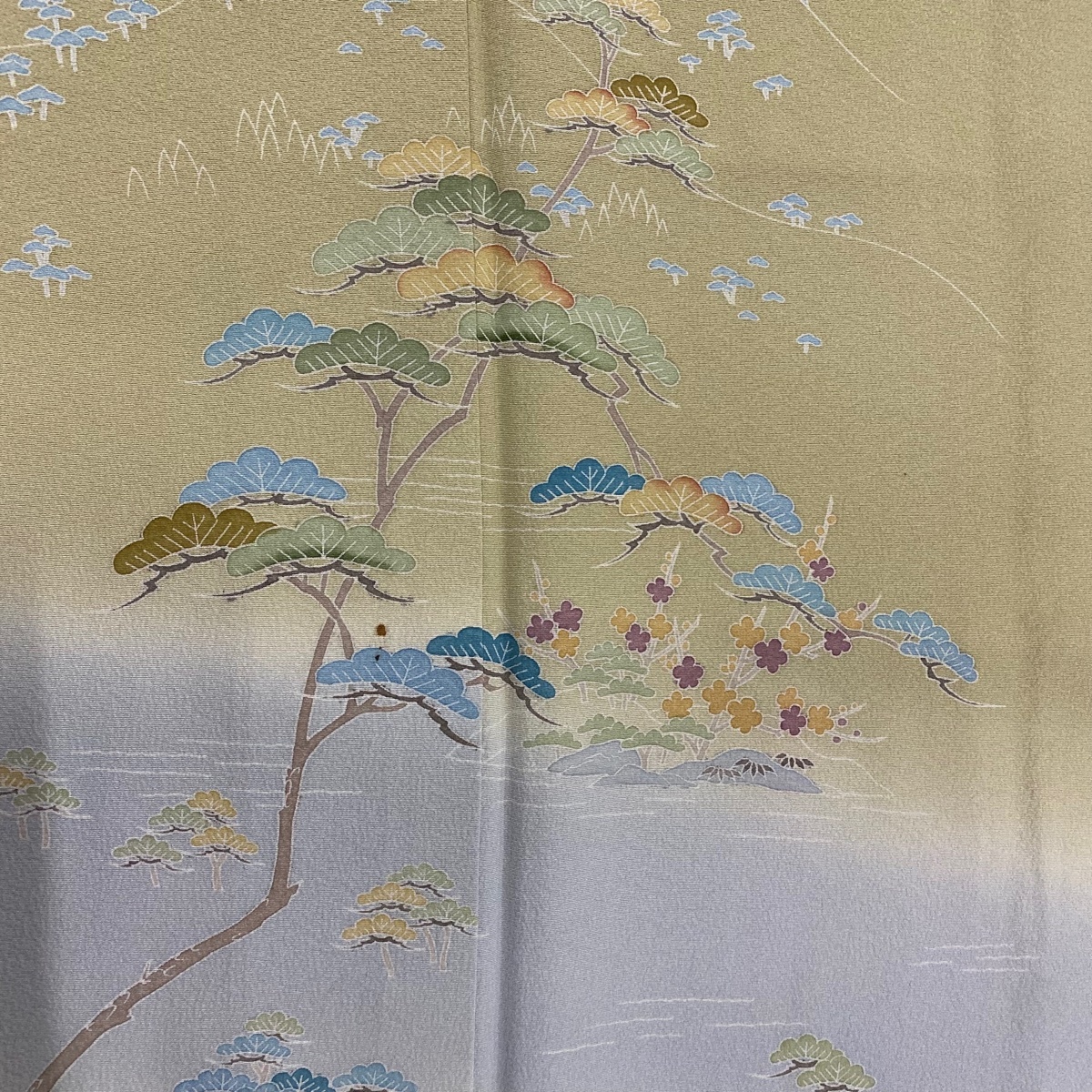 | 訪問着 秀品 落款 松竹梅 山並み 染め分け ぼかし 灰緑 袷 身丈153 裄丈61 S 正絹 【中古】 |