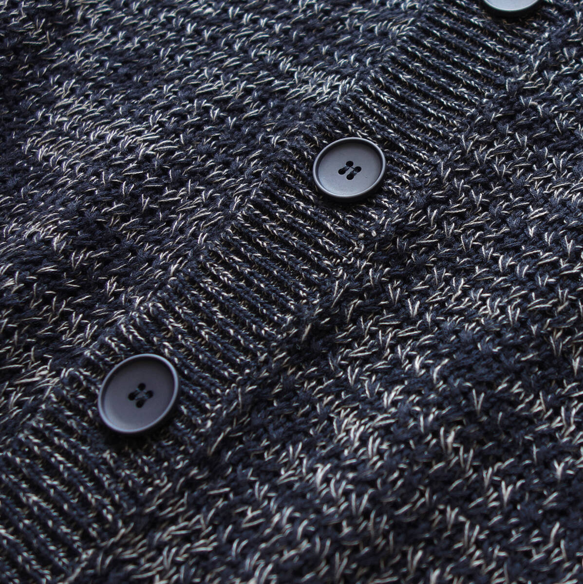 色は「ネイビーメランジ(Z4614)」になります。ベースの色はダークネイビー。そこにエクリュ(生成り)の糸を混ぜた、単色では味わえない深みと奥行きのあるメランジカラーになります。春夏にダークネイビーは重たいですが、このニットは軽やかに見えるところがいいですね。ザノーネのセンスが光る、なんとも絶妙なカラーリングだと思います。(※画像だと少しメランジがうるさく感じられるかもしれませんが、実物はもっと品の良い感じになるのでご安心ください。)