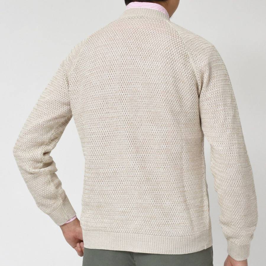 使用されている素材は、春夏にぴったりのリネンコットン素材です。最高品質のアイリッシュリネン(亜麻科の一年草フラックス)にコットンをブレンドした同素材は、ハリコシのあるリネンを主原料にしつつも、糸表面の毛羽立ちが少ないコンパクトヤーンに加工することにより、清涼感を損なうことなく“ゴワゴワしない優しく爽やかな肌触り”を実現していることが特徴です。上記のようなリネンコットン素材から紡がれた中番手糸をざっくり編み上げたバスケット編み7ゲージニットは、ミドルゲージであるにもかかわらず目に隙間があって通気性がよく、リネン特有のシャリ感とひんやりしたタッチを同時に楽しめ、汗をかいてもベトつかないので夏でも気持ちよく着用して頂けます。アイリッシュリネン特有の凛とした気品と深みのある風合いも素晴らしく、清涼感と高級感が入り混じる独特の外観に魅了されます。涼しさや爽やかさを加速させるメランジカラーも見逃せないポイントです。もちろん自宅で洗濯(水洗い)可能です。その際は“手洗い”と“平干し”を心掛けてください。