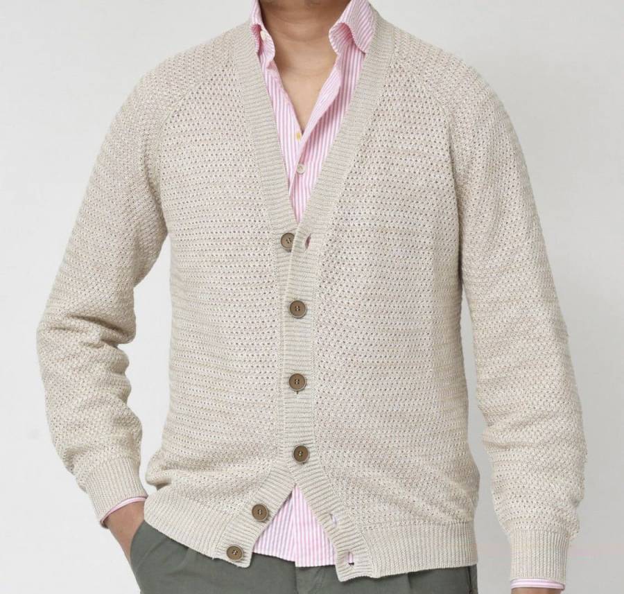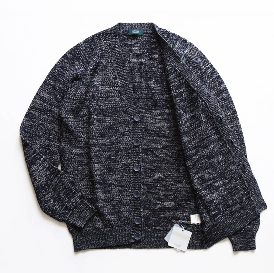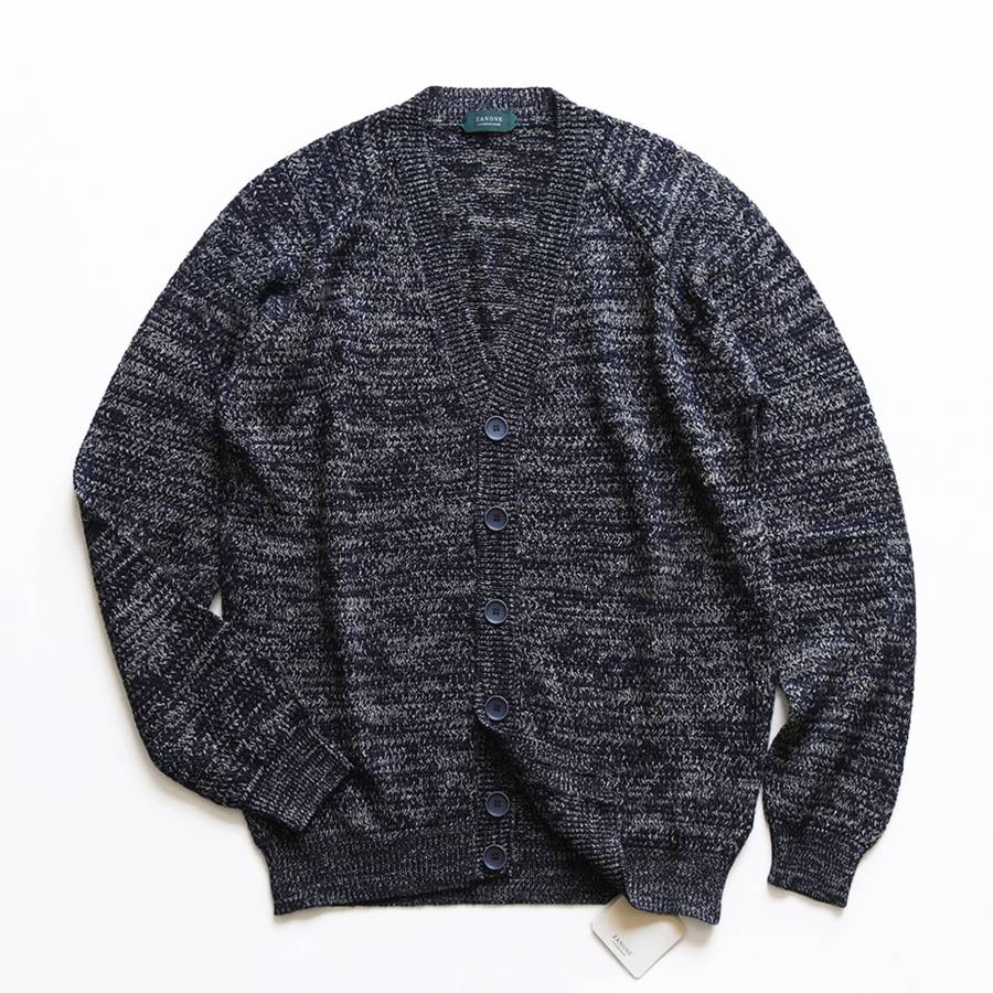 そんな“夏の羽織り”にドストライクなアイテムが、ザノーネの春夏コレクションから登場した「CARD RAG(812113 Z1326)」です。デザインは、トレンドアイテムとして再注目されている「ニットカーディガン」になります。フロントがボタン開閉式になっていて首(頭)を通さずに着られるのでさらっと羽織るのにうってつけです。素材には、清涼感溢れるリネンコットン素材を採用。立体的かつエレガントな外観に仕上げられたバスケット編みの7ゲージニットは、さらさらした爽やかな肌触りで汗をかいてもベトつかないので夏でも気持ちよく着用して頂けます。カットソーやシャツの上にこのカーディガンをさらっと羽織る姿を想像してみてください。暑い夏に吹く涼しい風になってくれると思います。プロパーだと6万円以上する品、しかもザノーネはセールになりにくいブランドなので、この価格ならすごくお買い得だと思います。