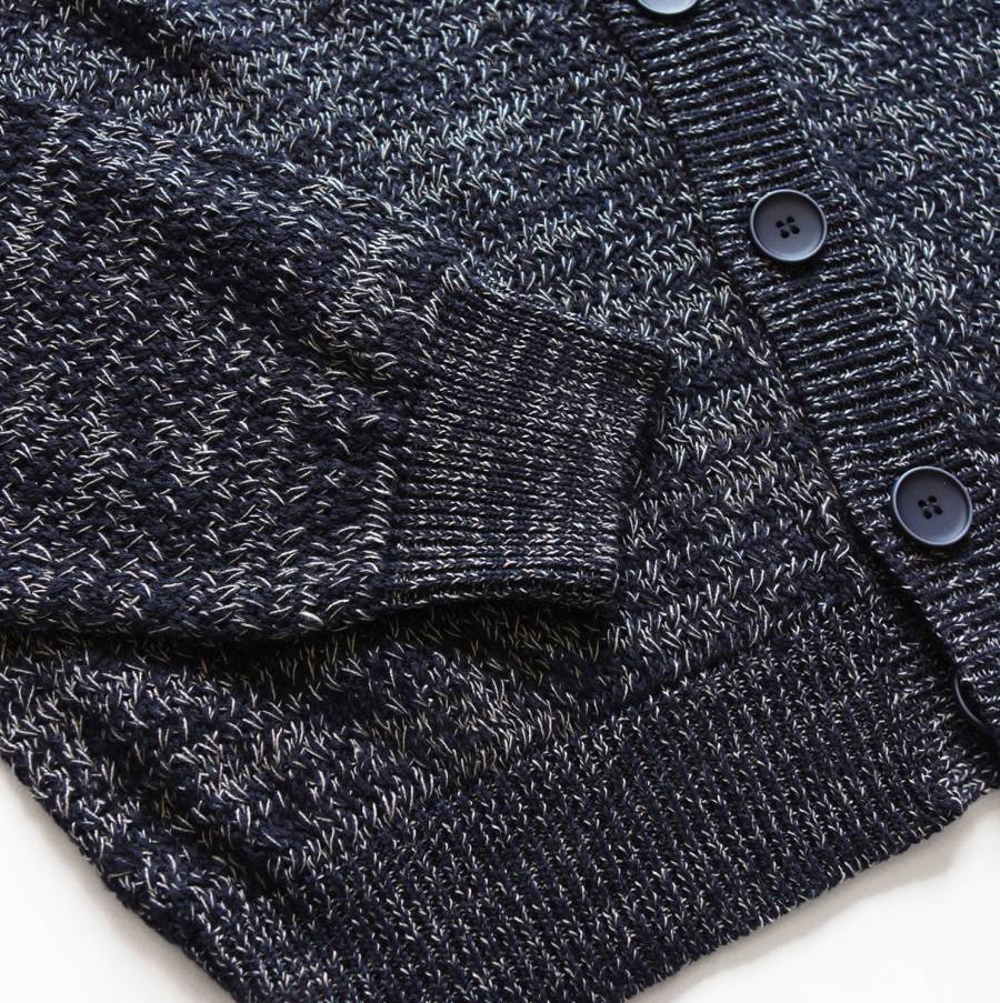 色は「ネイビーメランジ(Z4614)」になります。ベースの色はダークネイビー。そこにエクリュ(生成り)の糸を混ぜた、単色では味わえない深みと奥行きのあるメランジカラーになります。春夏にダークネイビーは重たいですが、このニットは軽やかに見えるところがいいですね。ザノーネのセンスが光る、なんとも絶妙なカラーリングだと思います。(※画像だと少しメランジがうるさく感じられるかもしれませんが、実物はもっと品の良い感じになるのでご安心ください。)