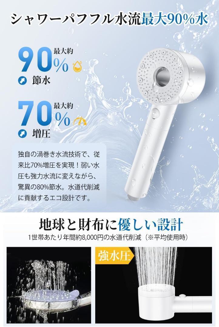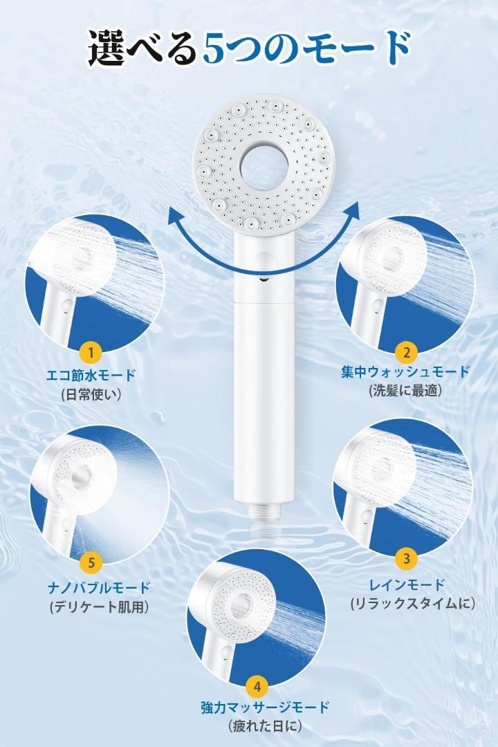 【5つのモード・驚異の節水で家計に優しく】5つのモード切り替えで、目的に応じた最適な水流を提供。低水圧時に約40%、中水圧時に約70%、高水圧時には最大90%の節水を実現。肌にもお財布にも優しい設計です。