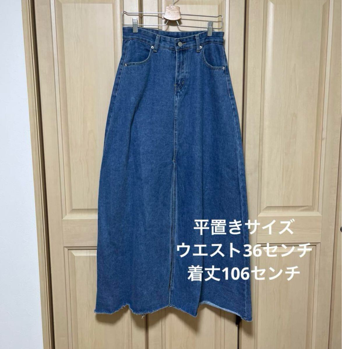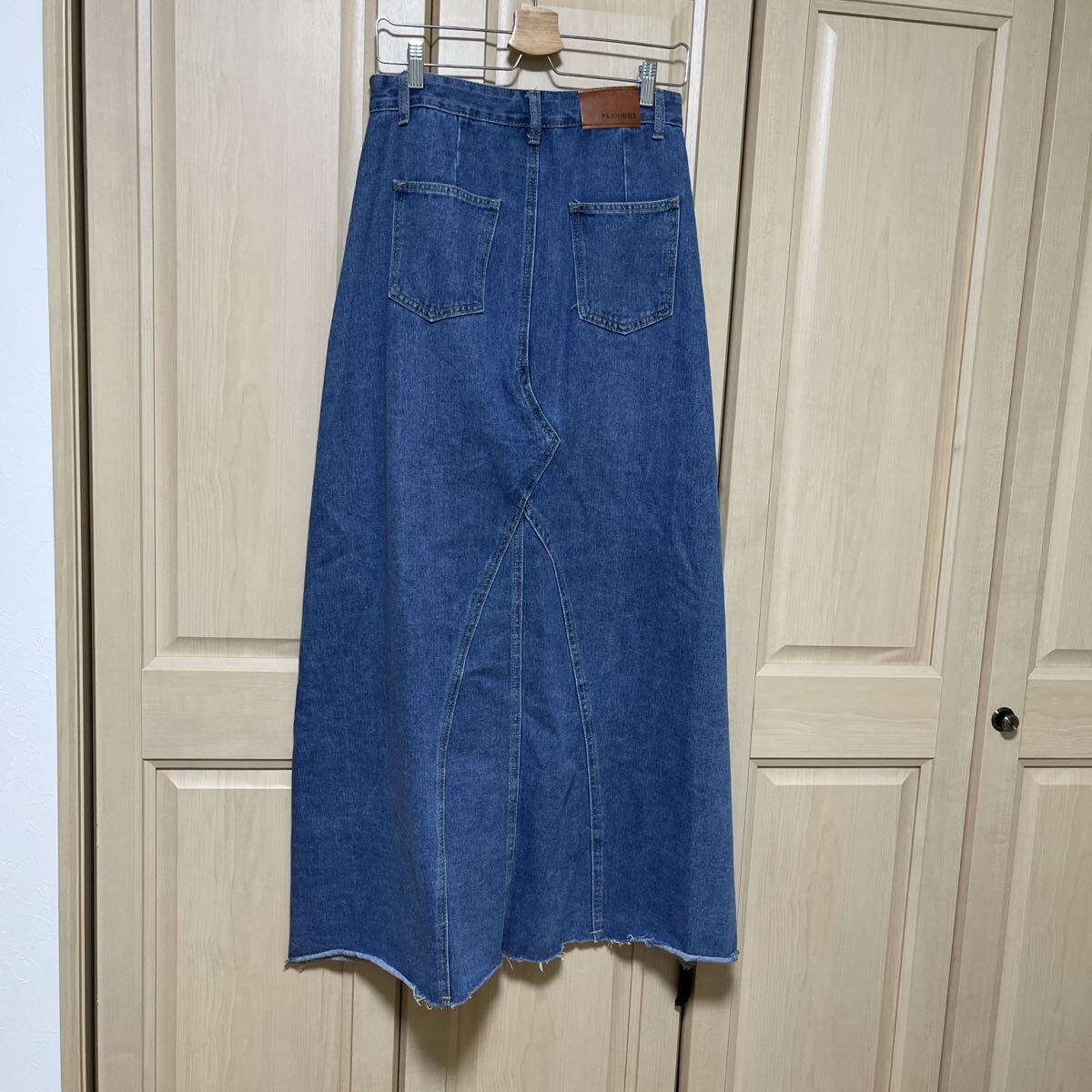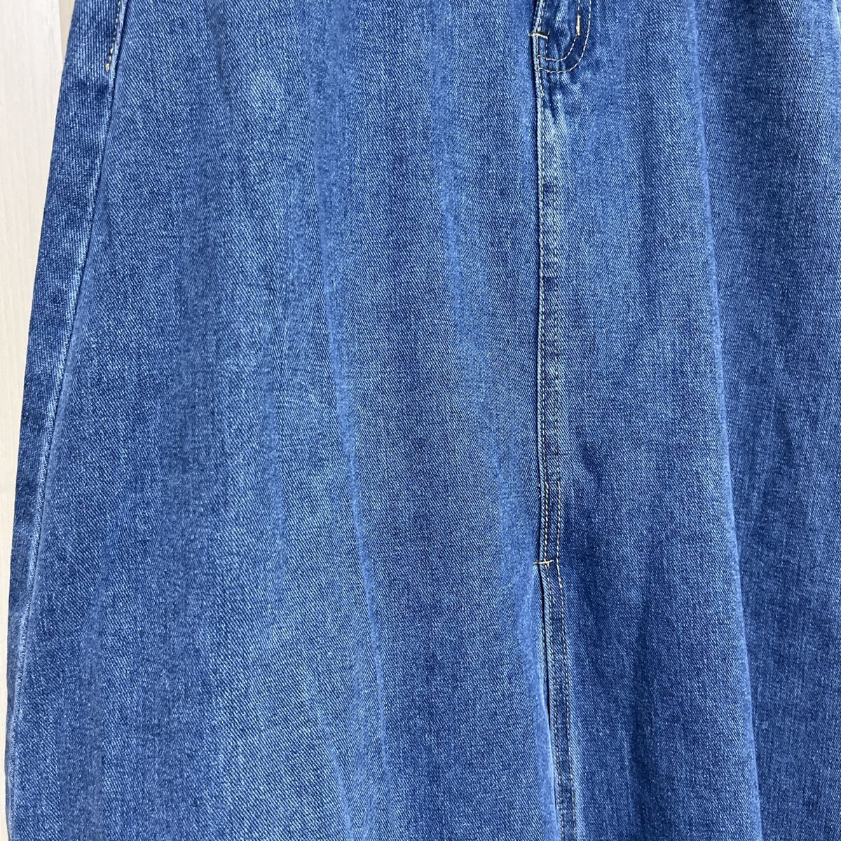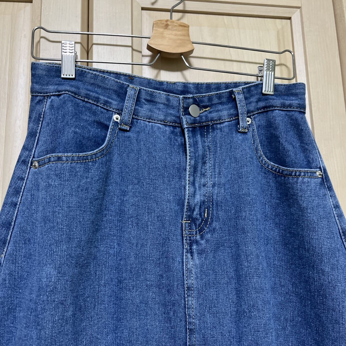 デニム素材のフレアスカート、前スリット入りで動きやすいデザイン。