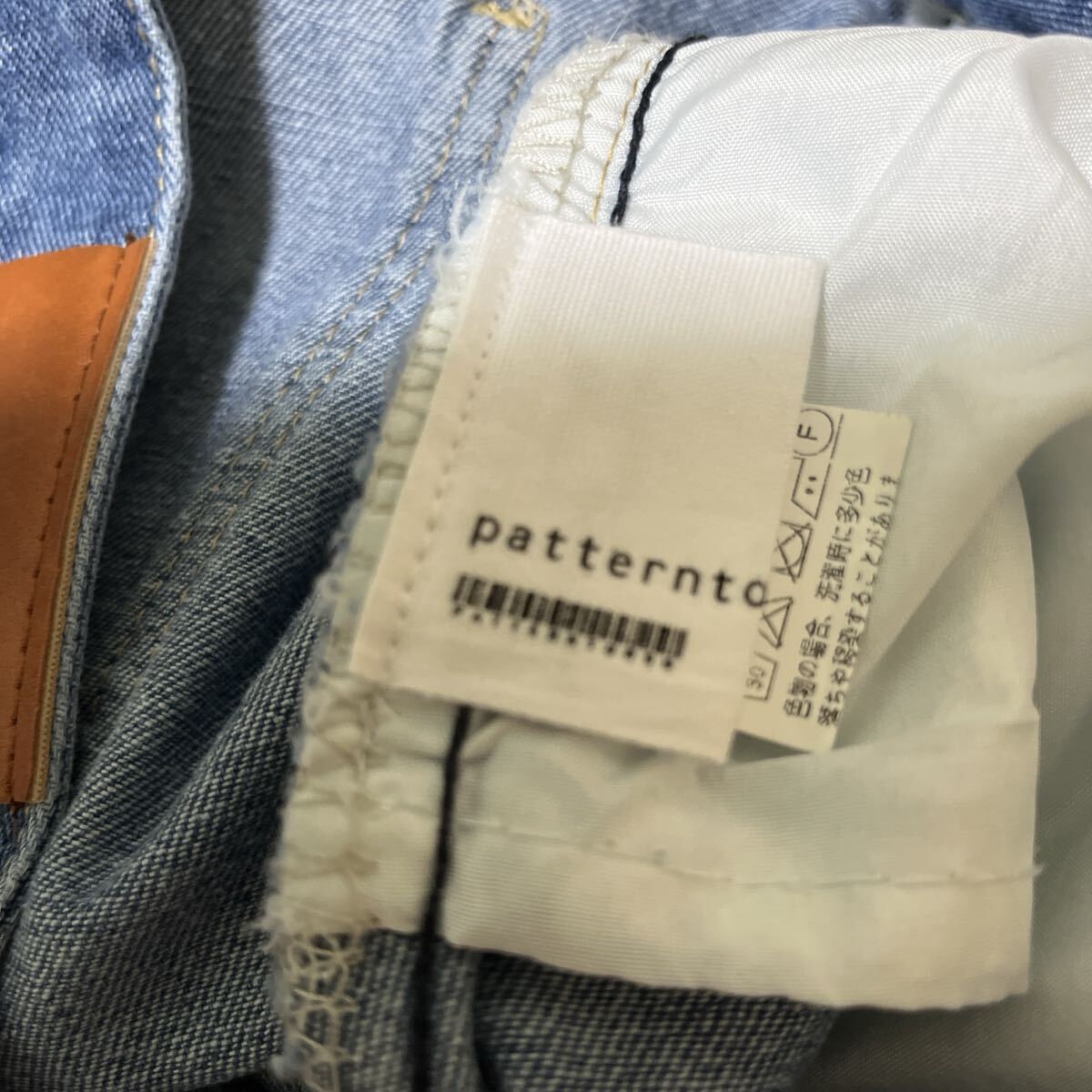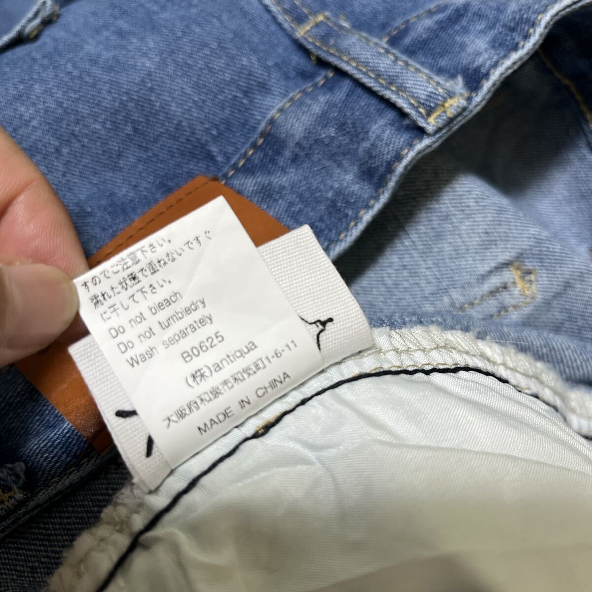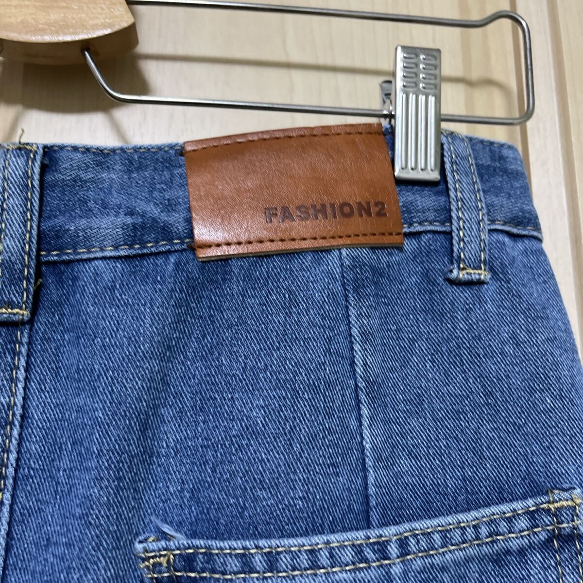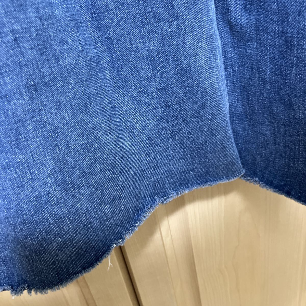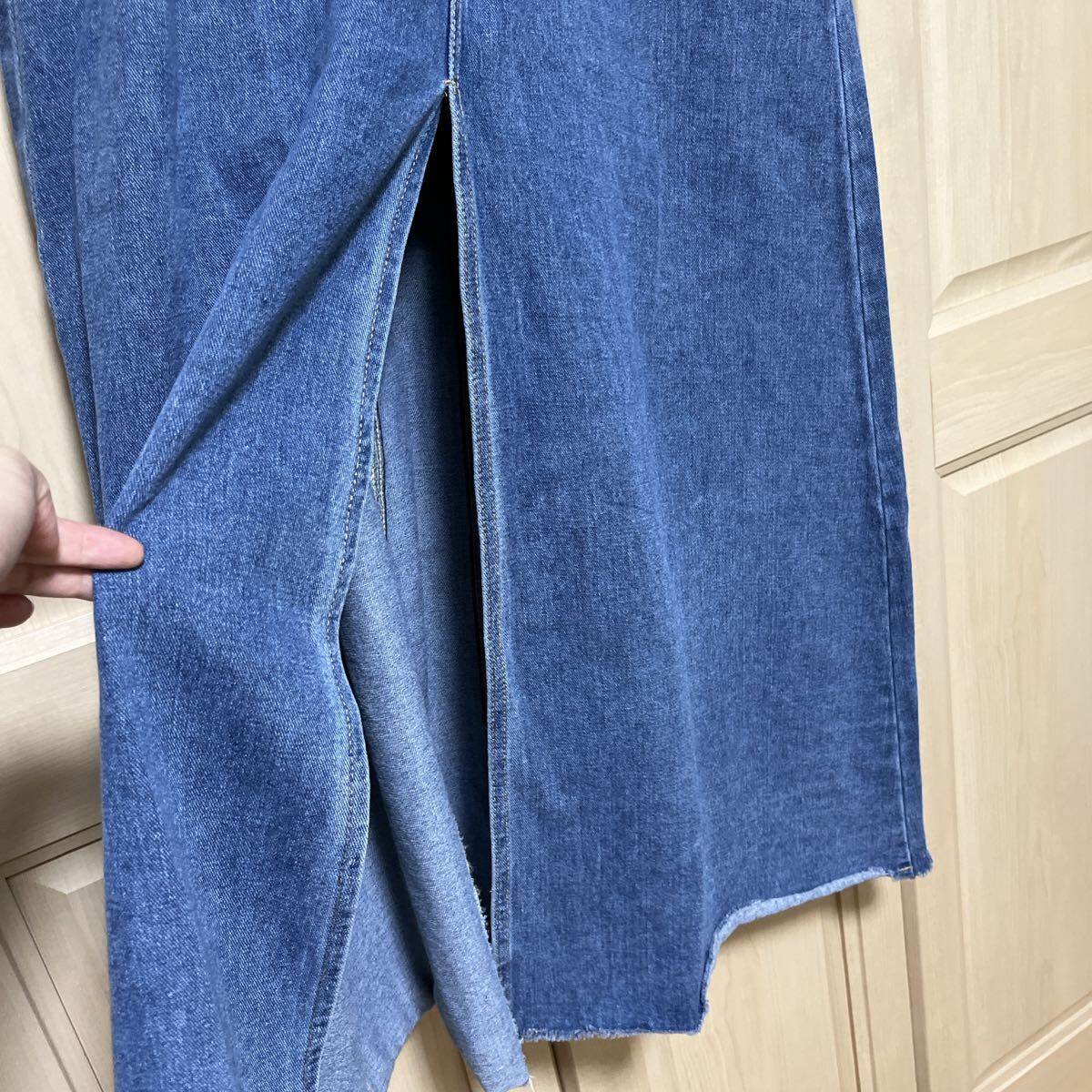 デニム素材のフレアスカート、前スリット入りで動きやすいデザイン。