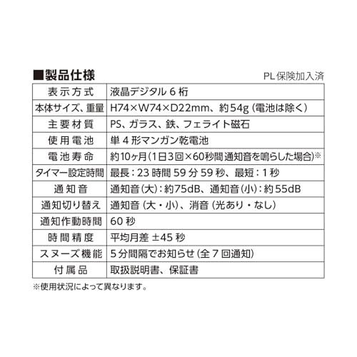 ・2種類のアラーム付きデジタル多機能タイマー ・時計モード(AM・PM表示)、タイマーモード(カウントアップ・カウントダウン)の機能付き ・4種類の通知設定あり(通知音大・小、光、消音) ・取扱説明書・書付 ・〈使用電池〉単4形マンガン乾電池2本(別売)