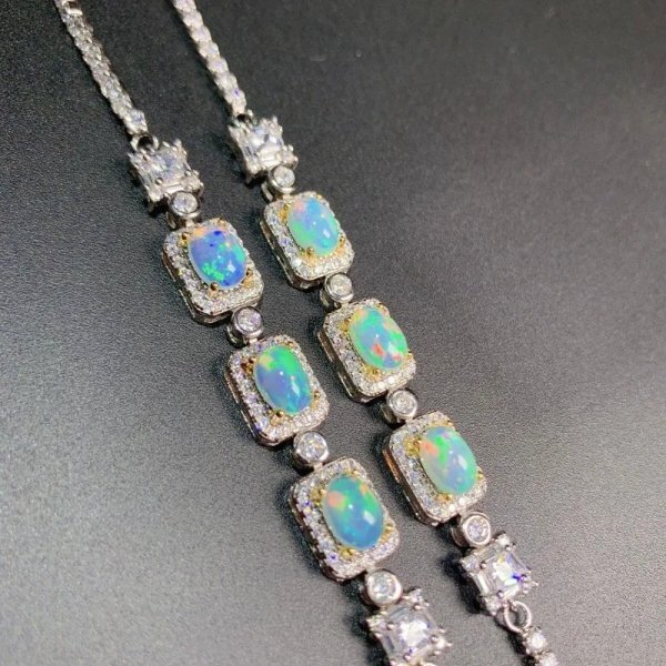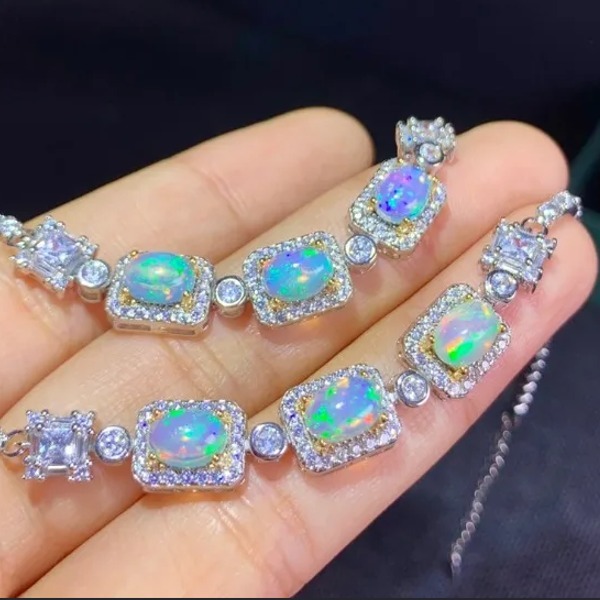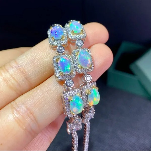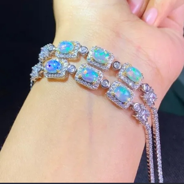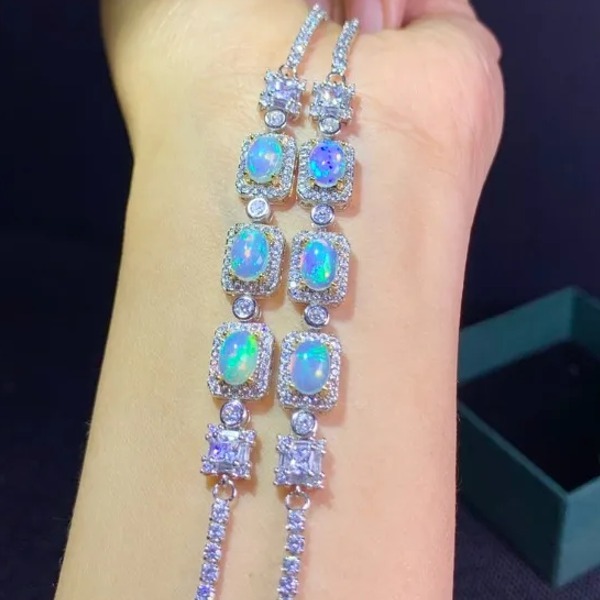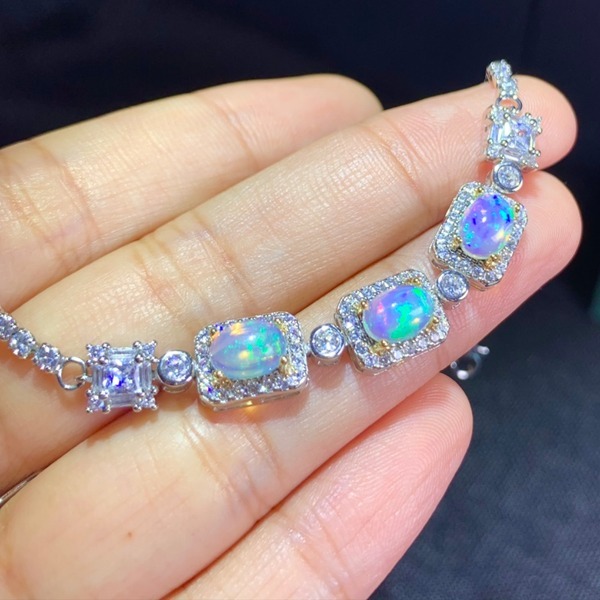 天然オパール ブレスレット、 5x7mm 、カラフルなファイアオパール、 シルバー 925、 女性の日常着に
