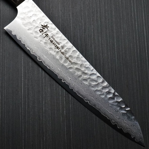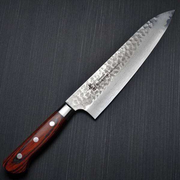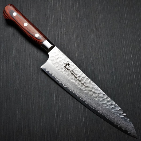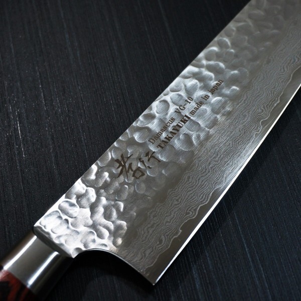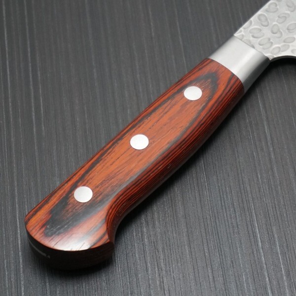 心材の刃はV金10号が使用されています。一般的にモリブデン鋼・モリブデン・バナジウム鋼・特殊鋼・硬質ステンレス・特殊ステンレスと記載されているものよりも高級な材質です。この材質はモリブデン、バナジウムだけでなくコバルトも含まれており、耐摩耗性、靭性、硬度の点で刃物鋼としての最適な条件を備えた高級ステンレス刃物鋼で、プロも使用しています。ステンレスですので、ステンレスではない包丁のように錆を気にする必要がありません。モリブデンとバナジウムが添加された医療用メスがよく切れるのはよく知られていますが、さらにコバルトが添加されているため鋭い切れ味がさらに持続します。つまり研ぐ回数を減らしてくれますので、メンテナンスが容易です。また槌目仕様は食材の切離れを良くしますので、お料理がスムーズに運びます。