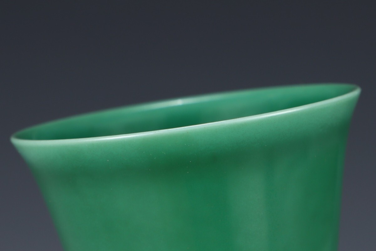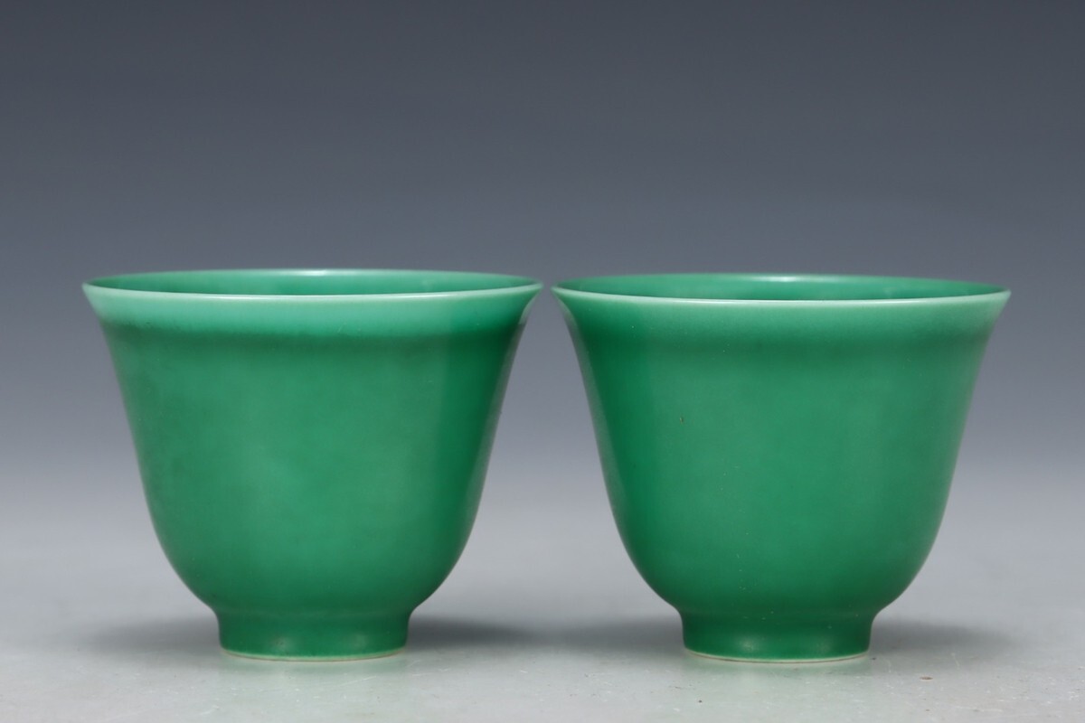 「明 成化年製 陶磁器 緑釉 鈴鐺杯一対」染付 置物 擺件 古賞物 中国古美術 旧蔵出