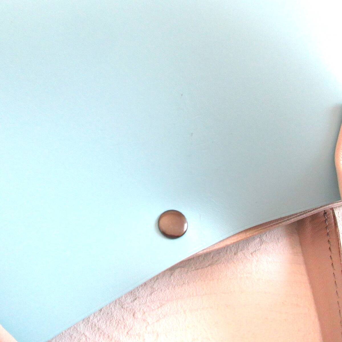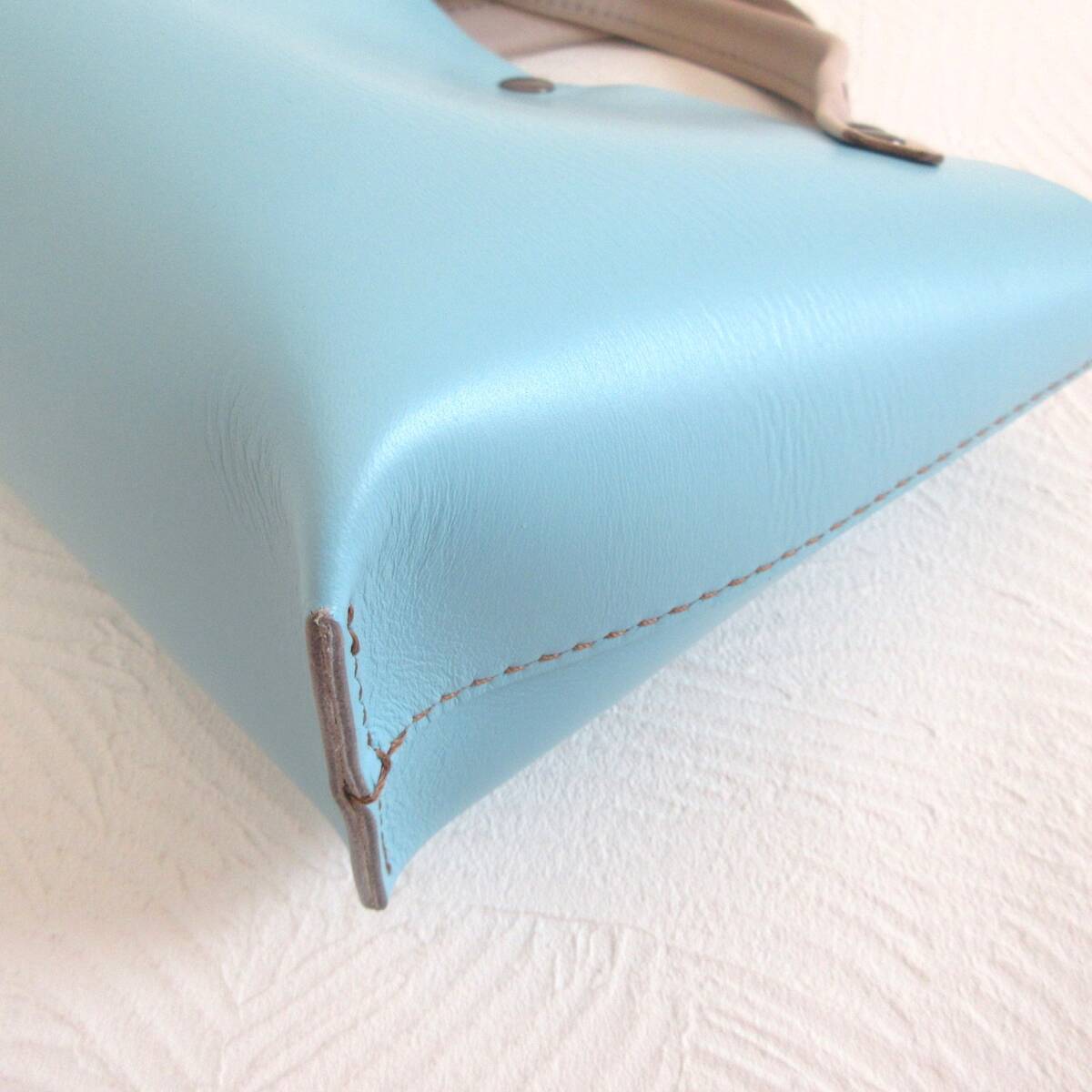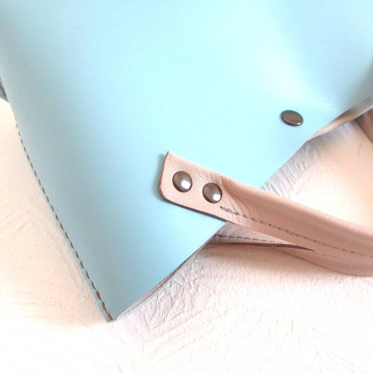 ◎肉厚でハリがある綺麗なスカイブルーにカフェオレブラウンのステッチでアクセントを付けています♪