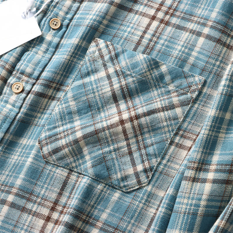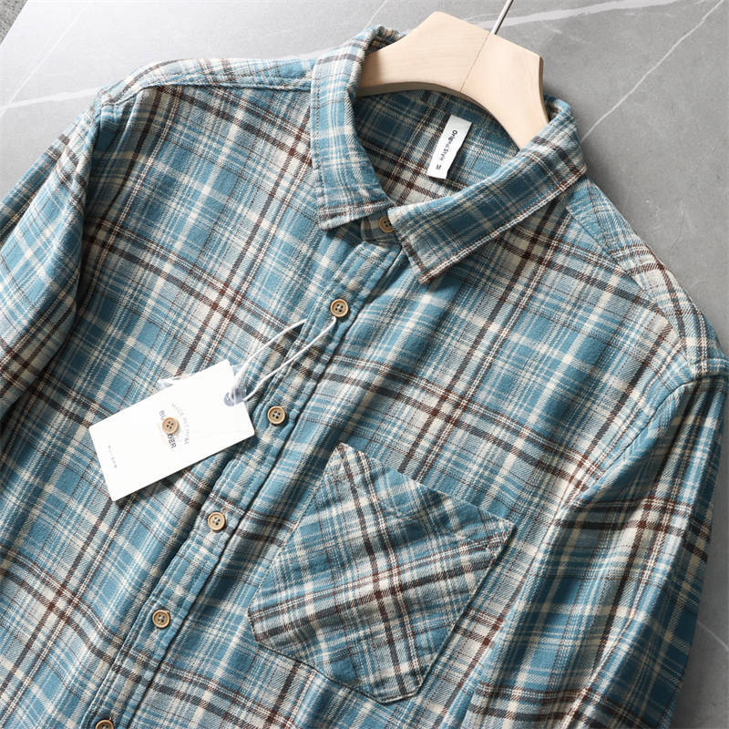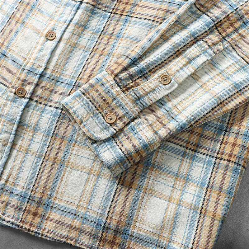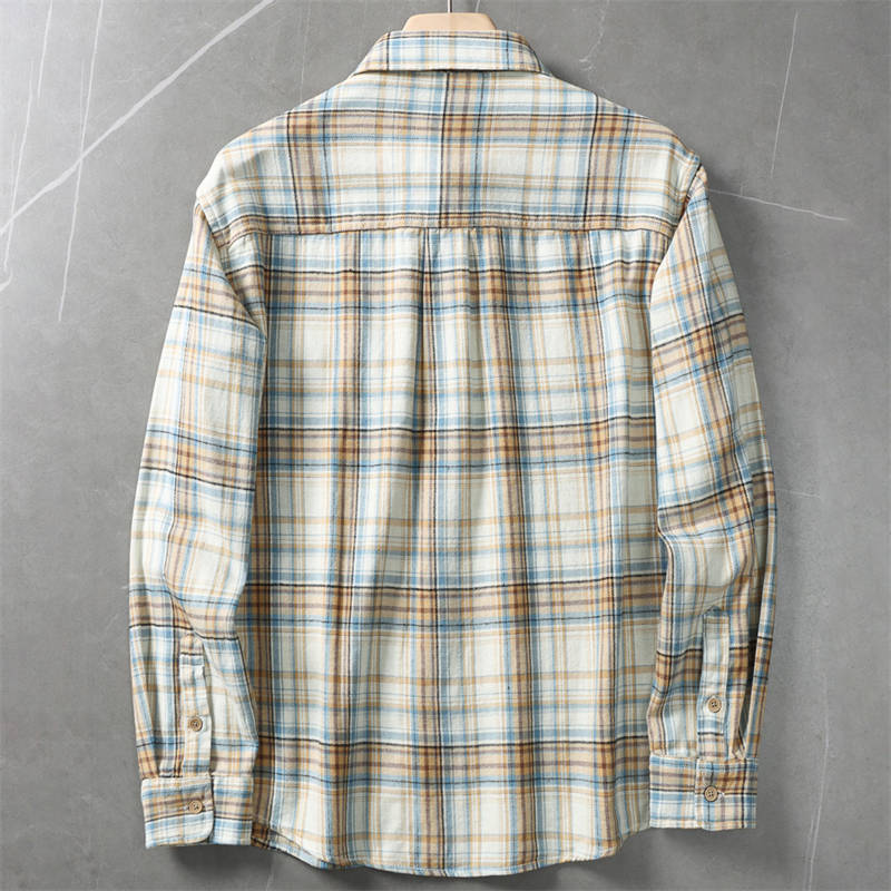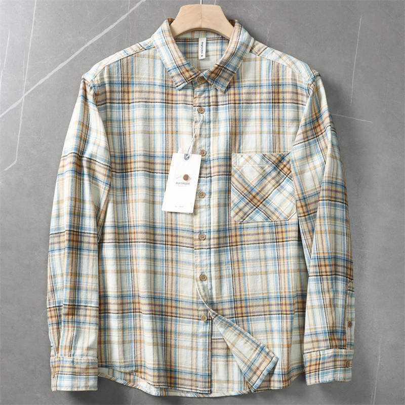 A112-Lベージュ 綿100% 長袖シャツ チェック柄 メンズ 新品 防シワ 薄手 春秋 折り襟 ポケット カジュアルシャツ トップス ゆったり