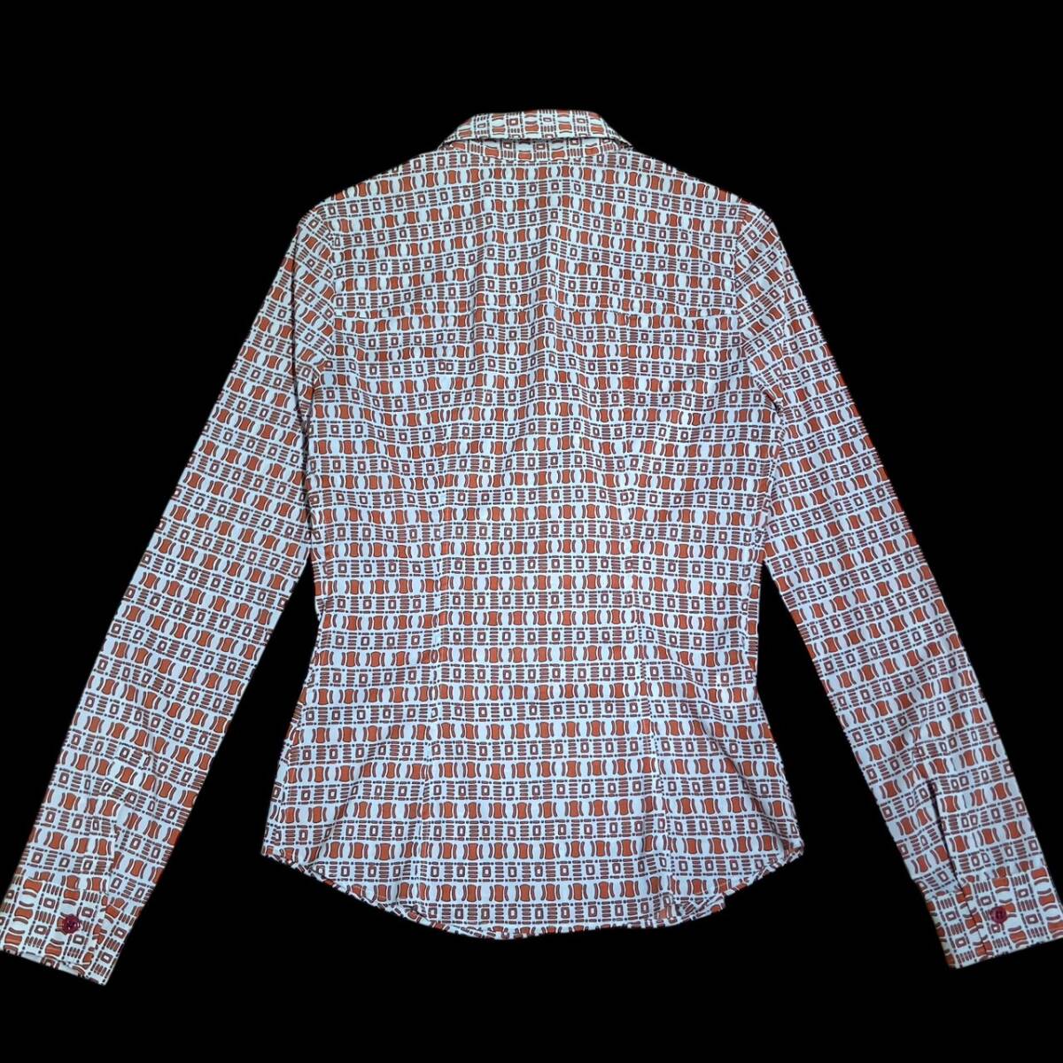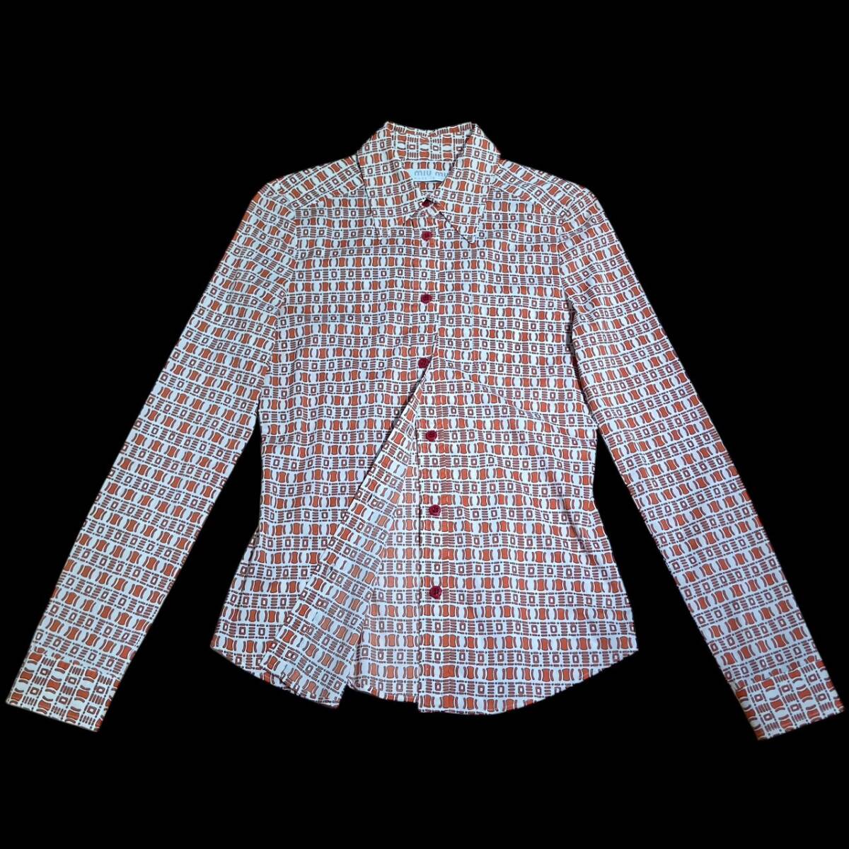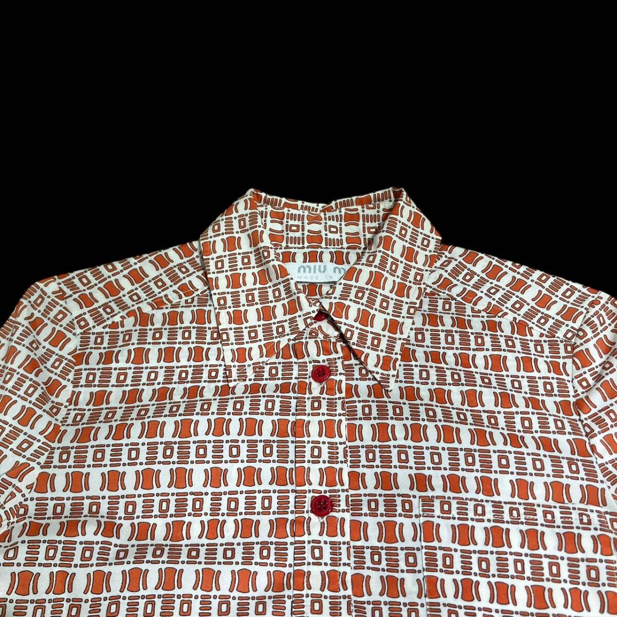 | 〇送料無料 ミュウミュウ 総柄 長袖 シャツ スリム ポリエステル オレンジ系 レディース サイズ40 |