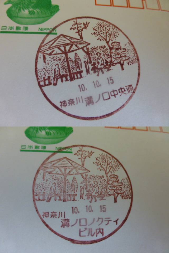 ☆鴛鴦はがき 初日風景印 神奈川2枚 溝ノ口中央通・溝ノ口ノクテイビル内 H10.10.15
